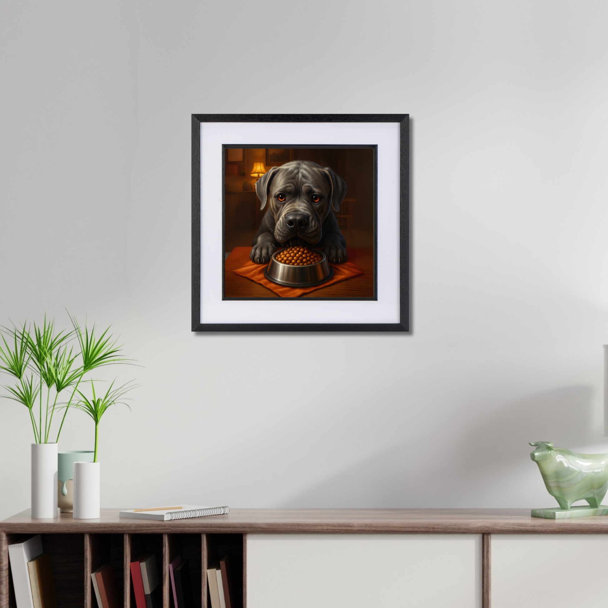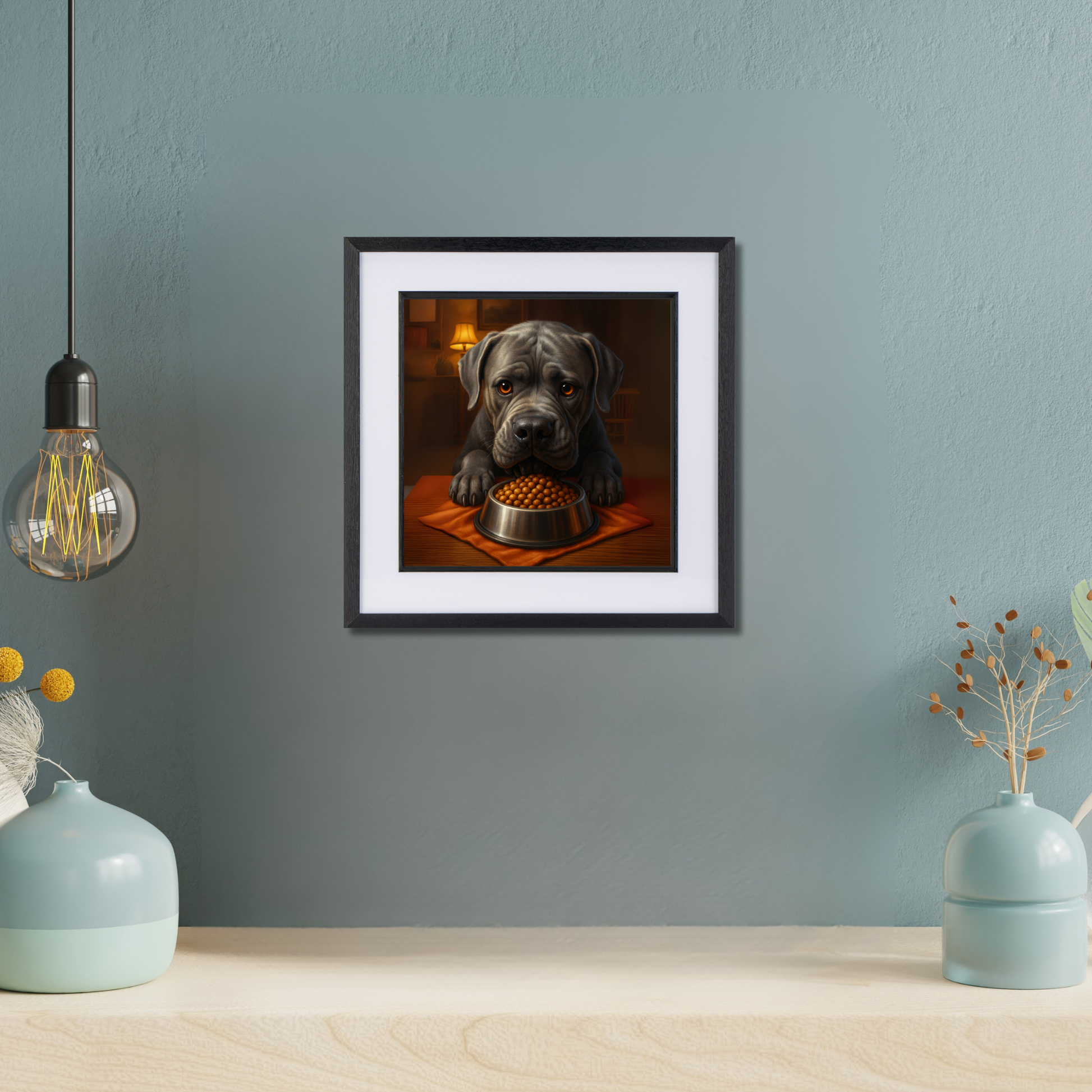 With a serious stare and a full bowl of kibble, this Cane Corso means business. Capturing the intense focus only a hungry dog can muster, this striking artwork is both funny and slightly intimidating—perfect for adding a bold statement to your kitchen, hallway, or man cave. A top pick for Cane Corso lovers and fans of dramatic dog wall art with attitude.
