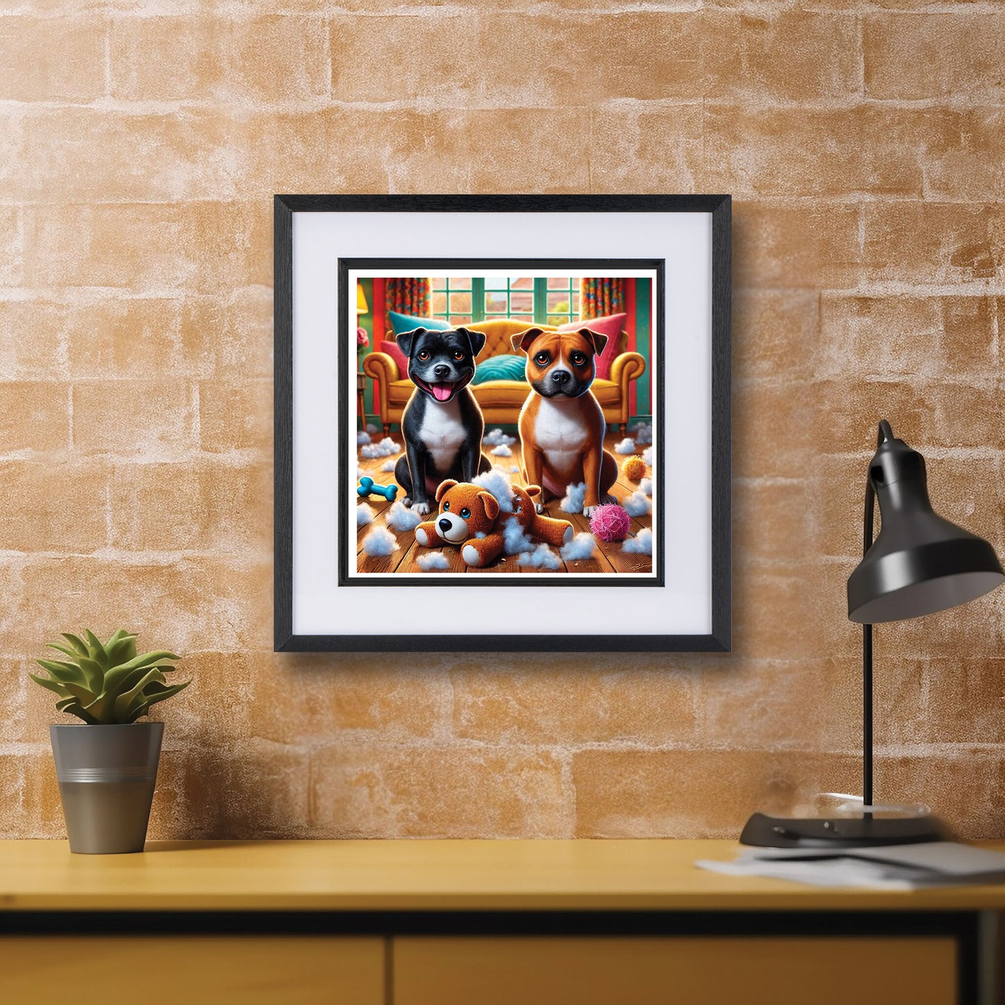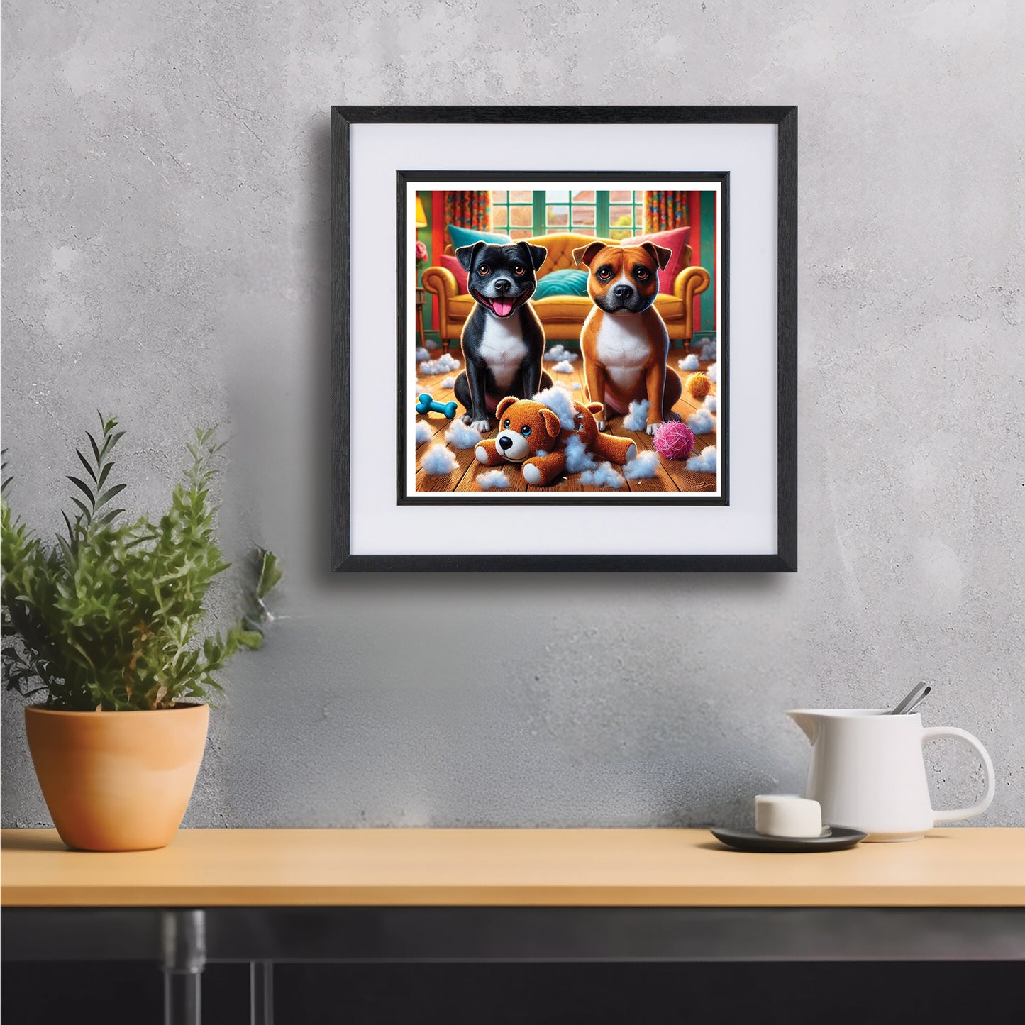 Celebrate your love for dogs with our exclusive, one-of-a-kind art pieces! "Bearly Innocent" depicts two dogs sitting in a cosy, colourful living room, surrounded by the stuffing of a torn-apart teddy bear. The black-and-white dog smiles innocently, while the brown-and-white dog looks guilty. The playful, vibrant artwork contrasts the dogs' expressions with the mischievous chaos they've created.