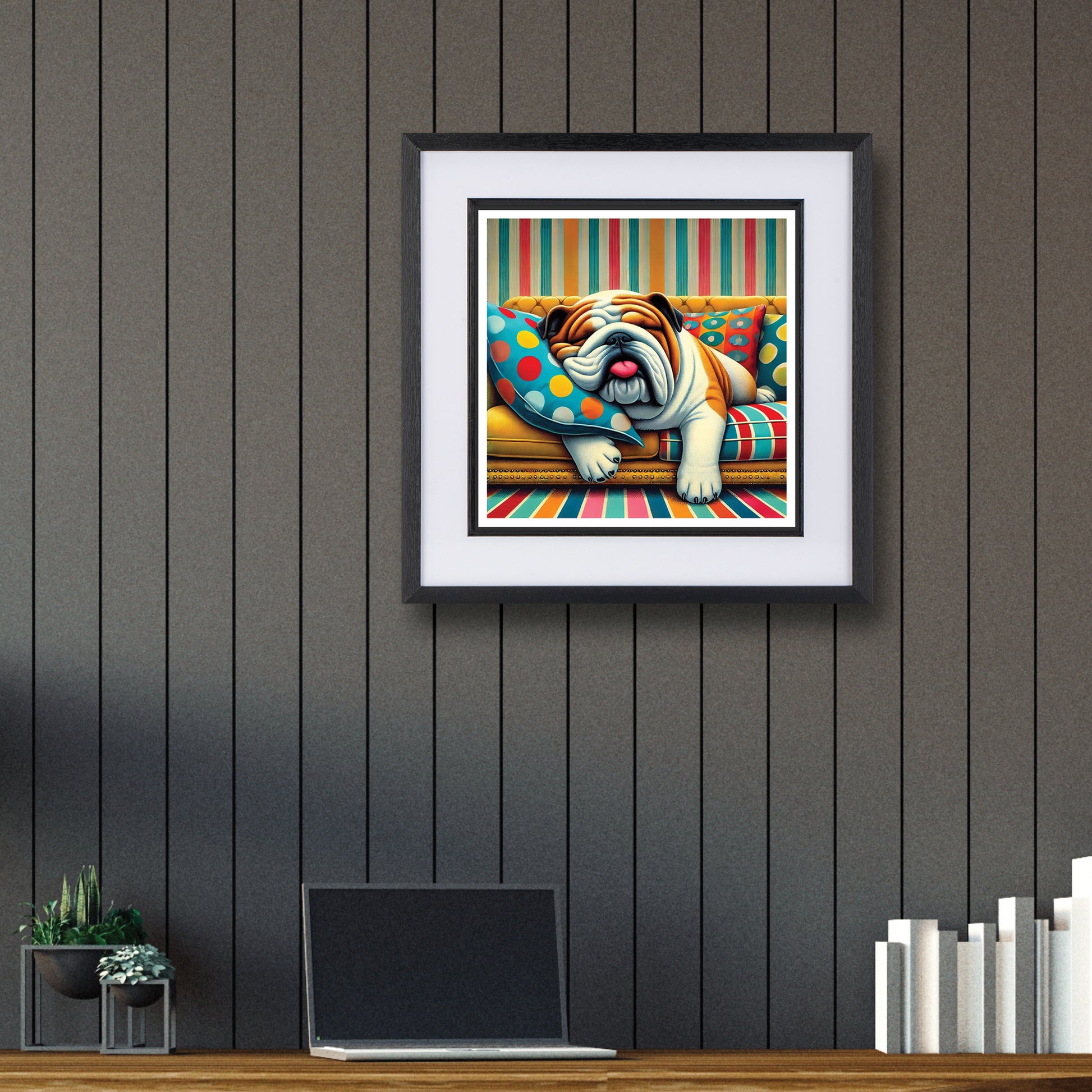 Delight the dog lover in your life with stunning artwork they'll adore! "Bulldog Couch Coma" captures the ultimate chill-out moment with a bulldog blissfully snoozing on a cosy settee in a vibrant, colourful room. This artwork is perfect for anyone who loves the laid-back vibe and wants to bring a splash of colour and cuteness into their space!