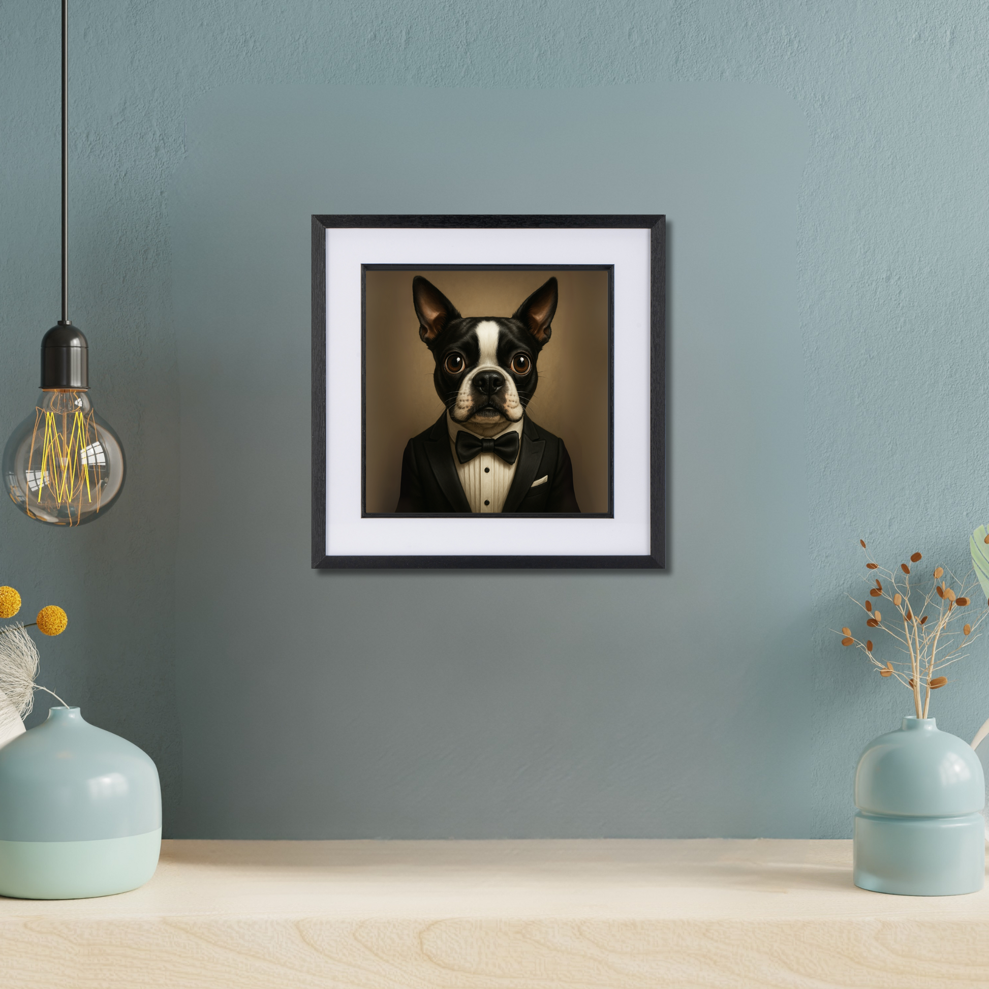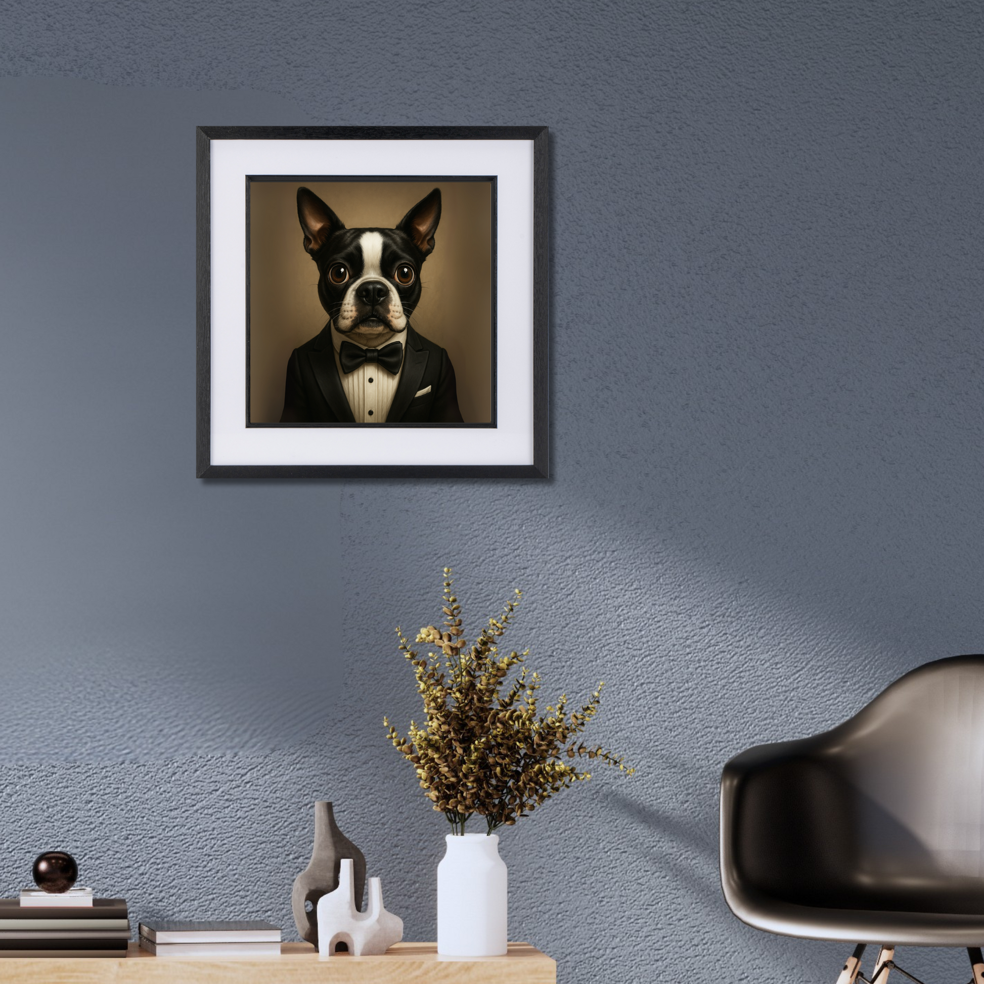Say hello to the boss of all Boston Terriers. Dressed to impress in a classic tuxedo and bowtie, this hilarious and stylish dog portrait is perfect for anyone who loves a good laugh with their home decor. Ideal for living rooms, home offices, or as a standout gift for dog dads, this artwork blends sophistication with a whole lot of personality. A must-have for fans of Boston Terrier wall art and dapper dog designs.