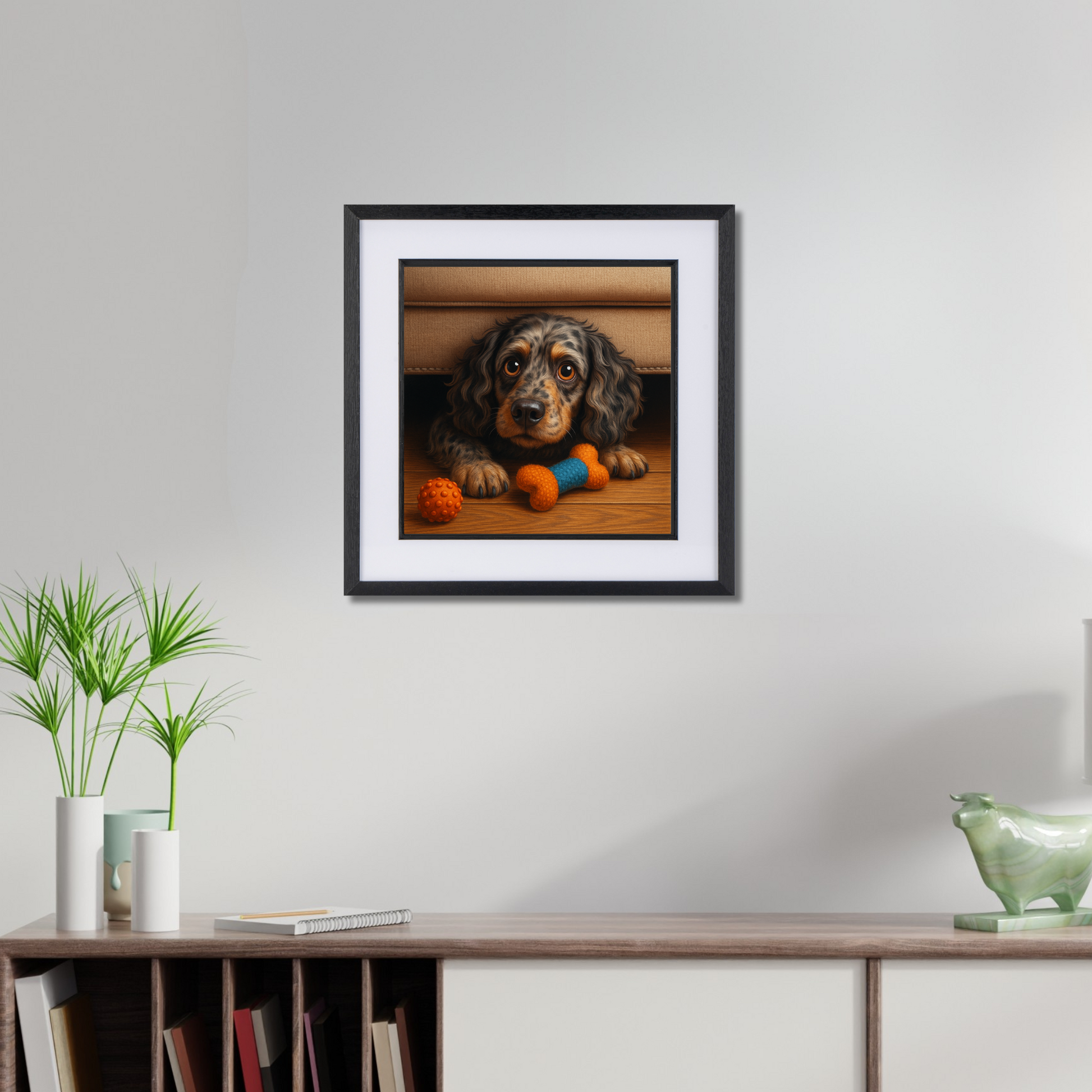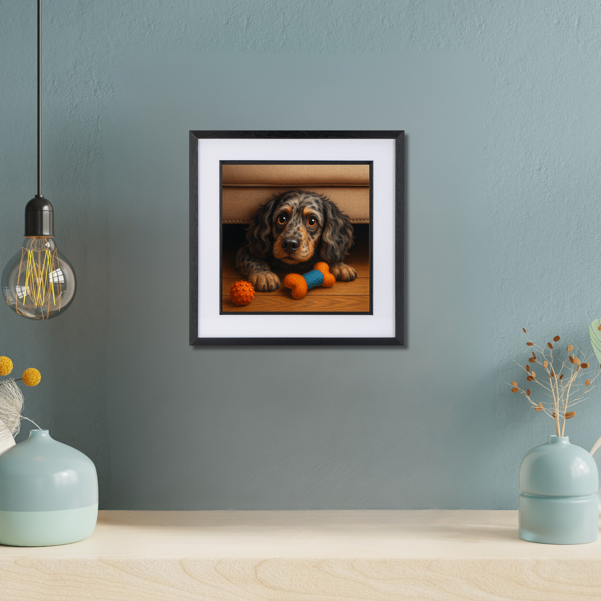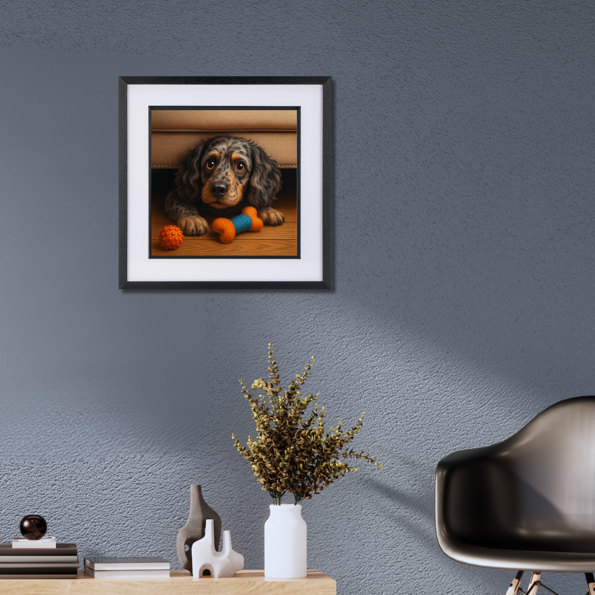 Tucked under the sofa with toys in tow, this adorable blue roan Cocker Spaniel has mastered the art of sneaky playtime. With those big, innocent eyes and paws guarding the loot, this heartwarming dog artwork is perfect for adding a playful touch to any home. Ideal for dog lovers, children’s rooms, or cosy corners, it’s a must-have for fans of Spaniel wall art and cheeky canine charm.