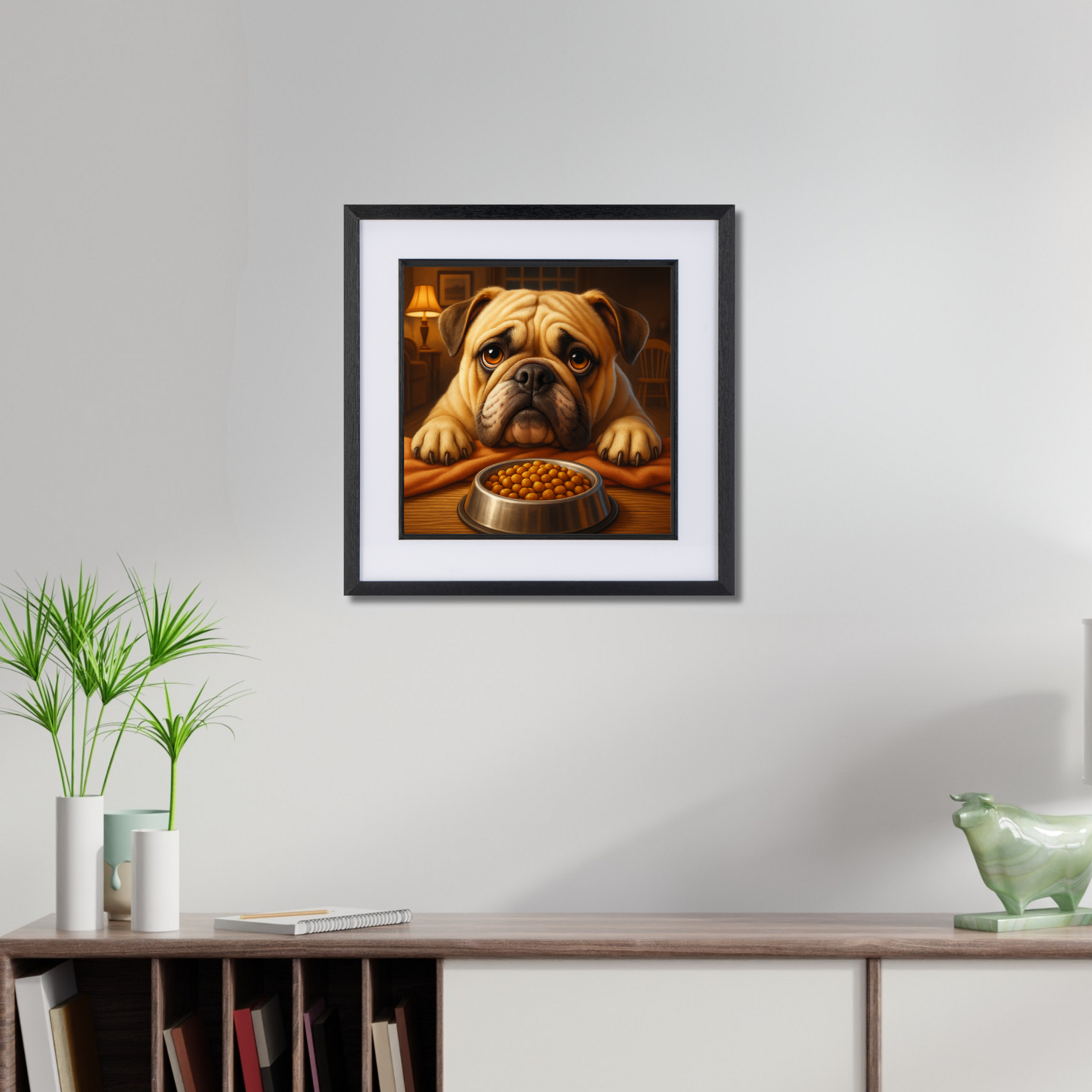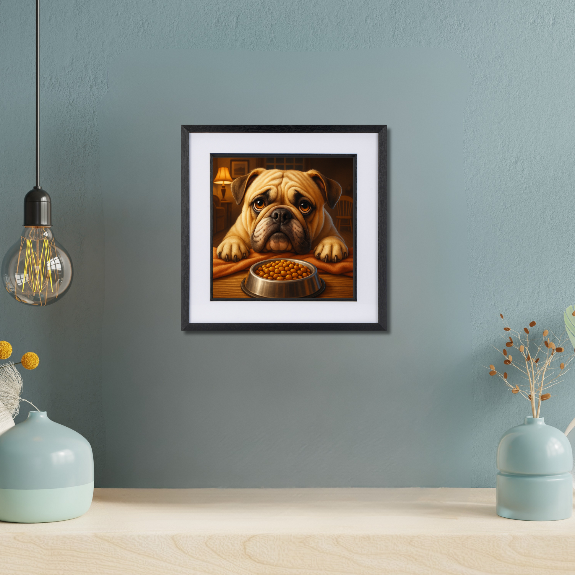 This hilarious Bulldog artwork captures the ultimate look of disappointment—with a side of drama. Staring woefully at a bowl of kibble, this expressive pup clearly had higher culinary expectations. Perfect for kitchens, dining rooms, or anyone who’s ever judged a meal with their eyes, this print blends humour and heart in one unforgettable expression. A top pick for Bulldog lovers and fans of funny dog wall art.