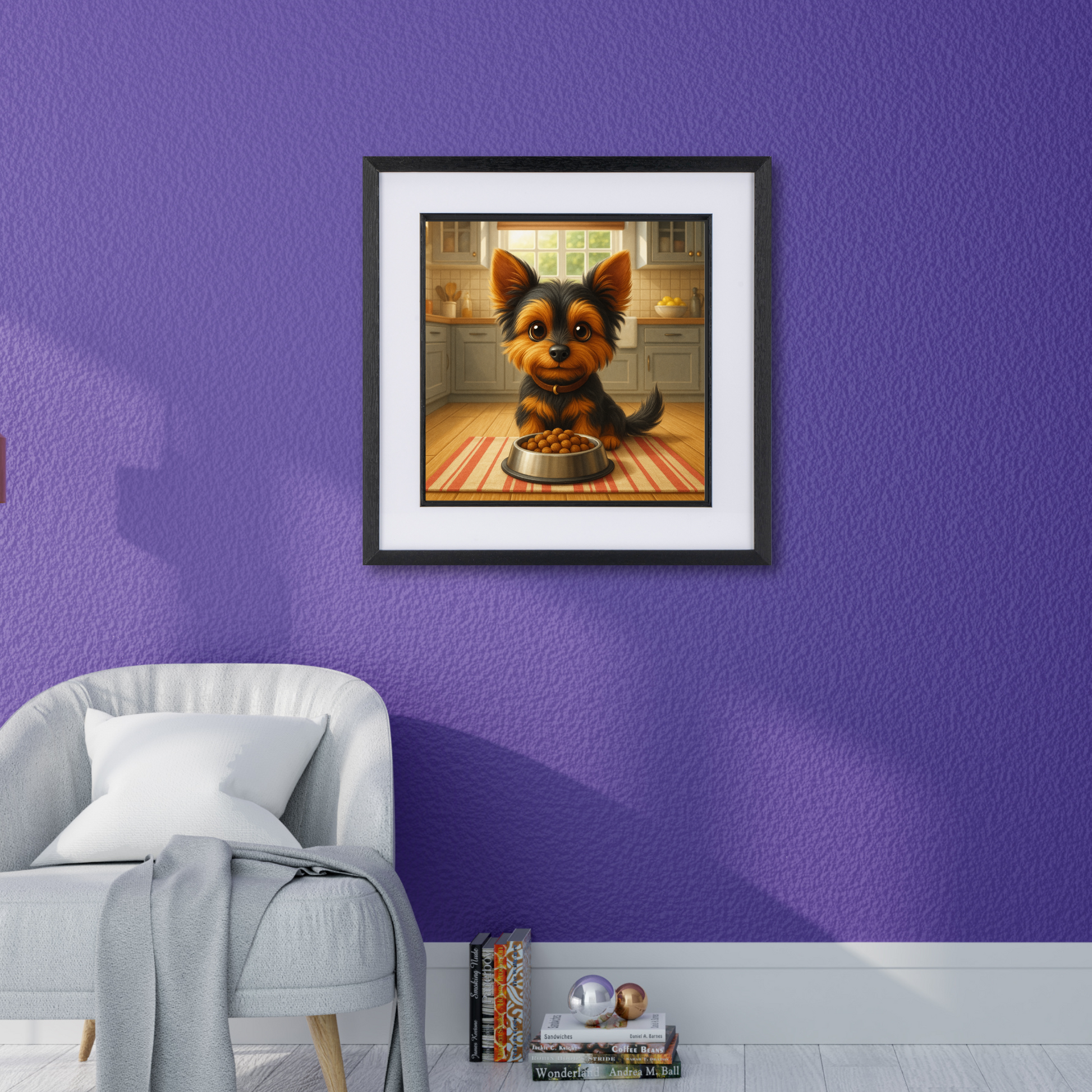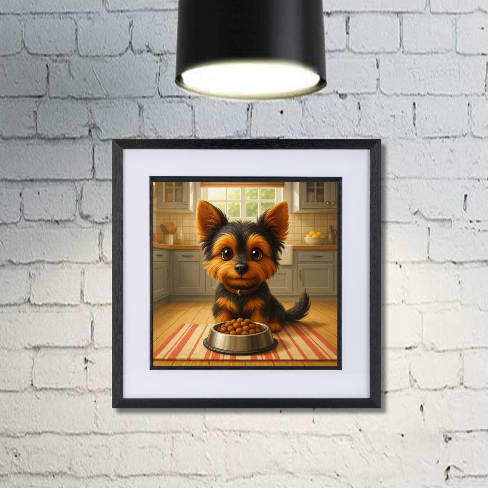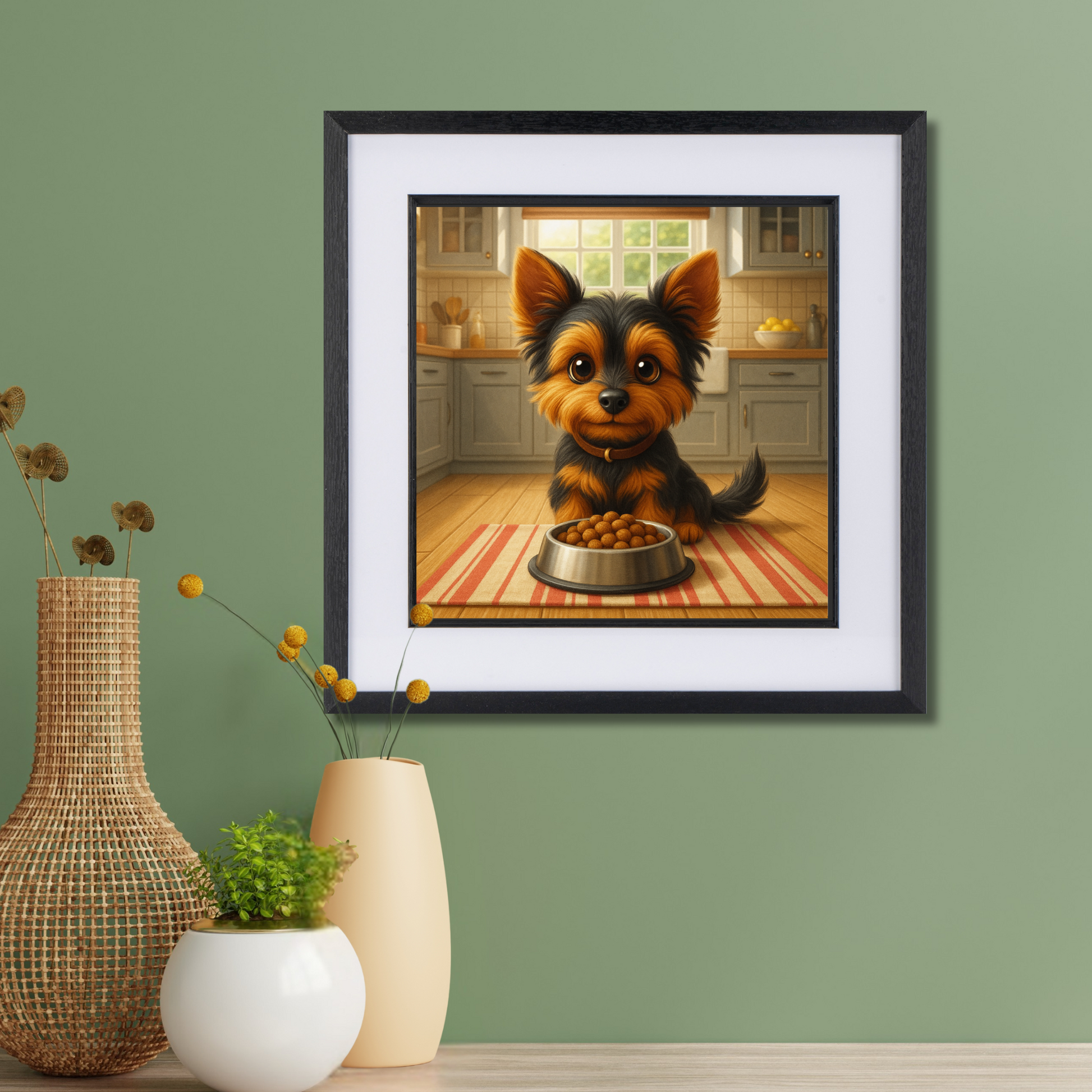 That face says it all—this Yorkshire Terrier was expecting a little more flair in the food department. With wide eyes and a perfectly poised sit, this charming artwork captures the classic look of dinnertime drama. Ideal for dog lovers who know the bowl is full, but the standards are higher.