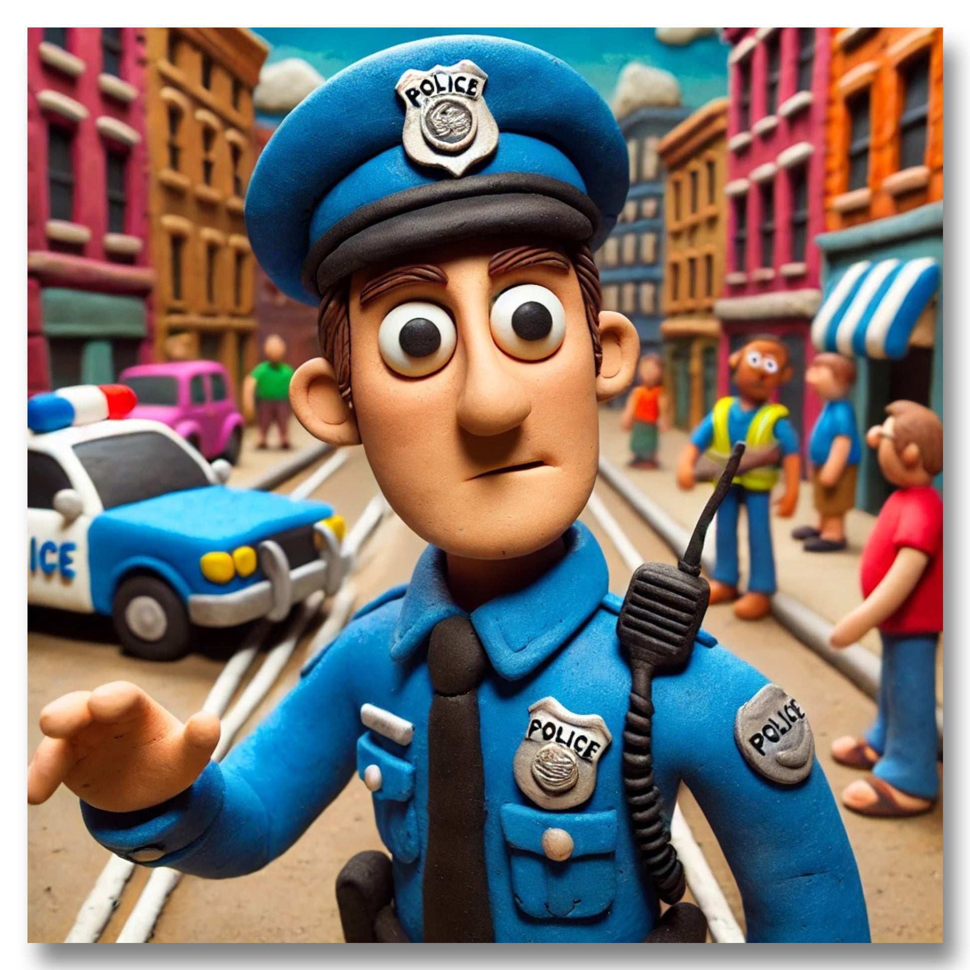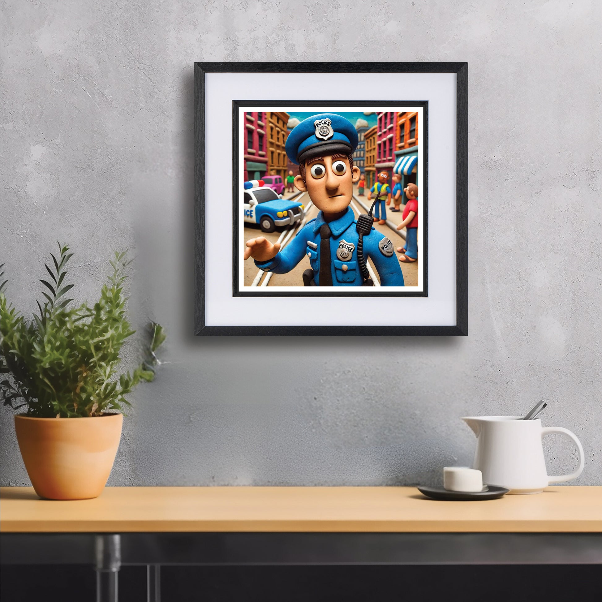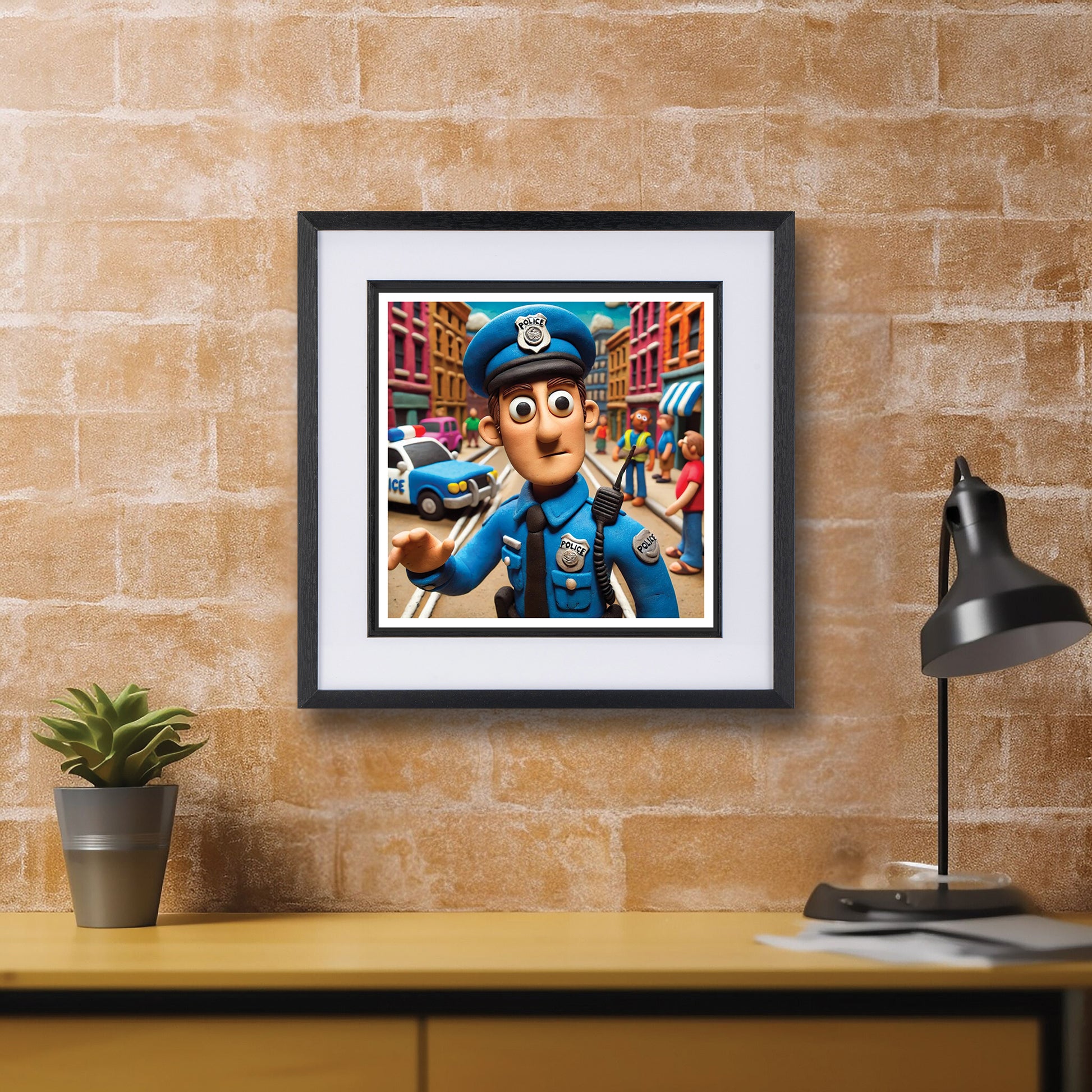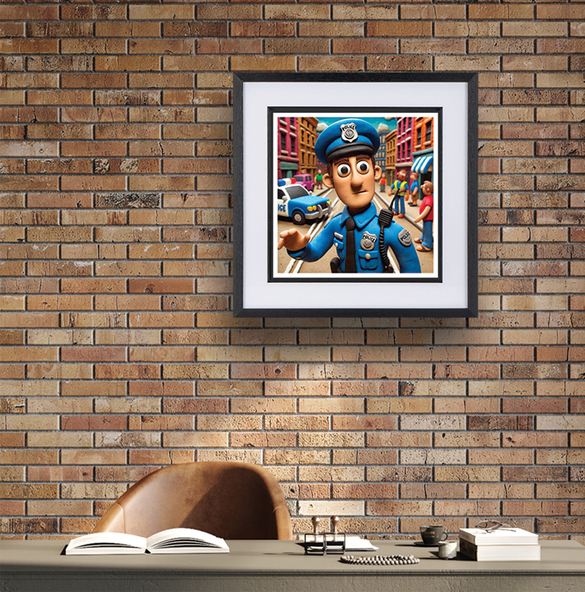 The perfect present for enthusiasts of unconventional, eccentric, and eye-catching art. "Law and Disorder" features an American police officer standing confidently, ready to serve and protect. This image captures the balance of authority and community, highlighting the important role officers play in maintaining peace and order.
