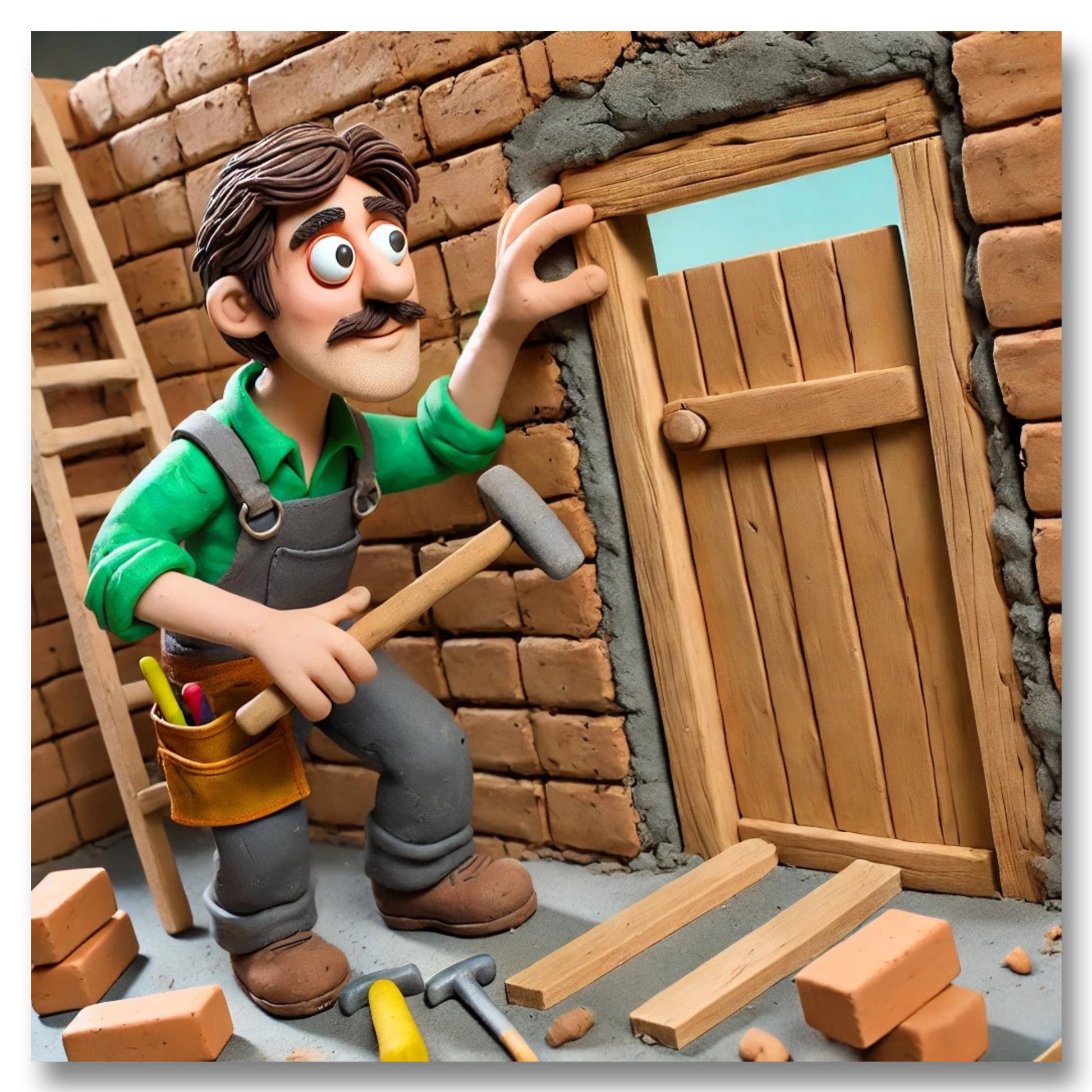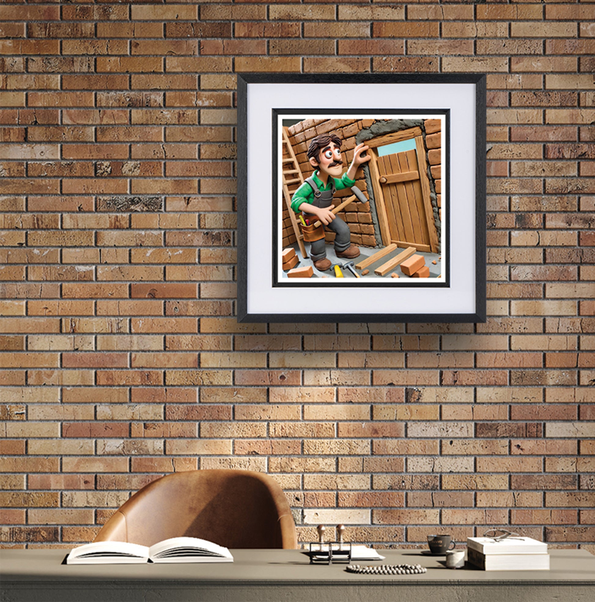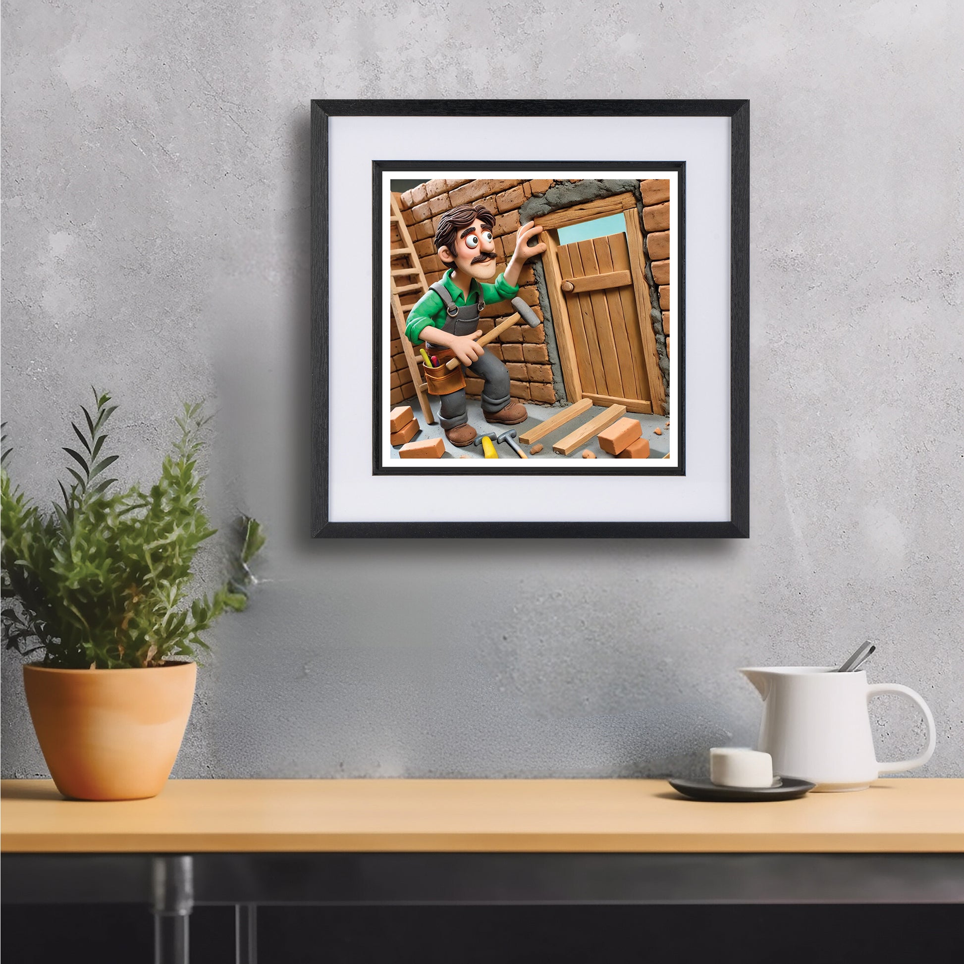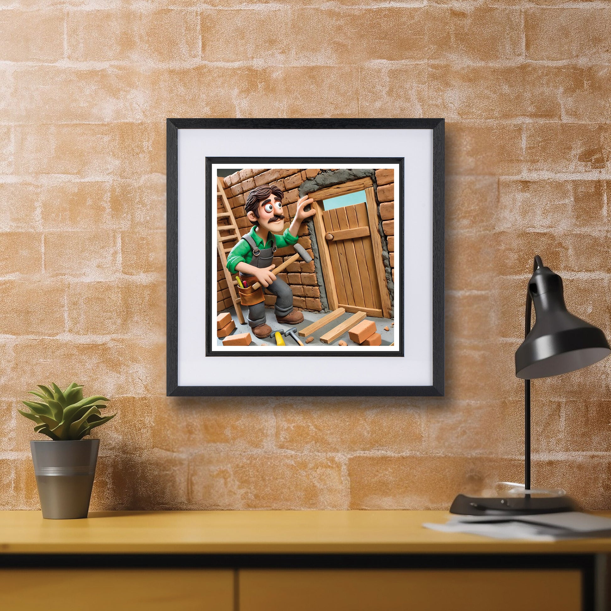 The ultimate gift for fans of unique, quirky, and offbeat artistic creations. "Making a Grand Entrance" shows a workman skillfully installing a door into a wall, focused on creating the perfect opening. This image captures the blend of craftsmanship and practicality, turning a simple task into a bold statement!