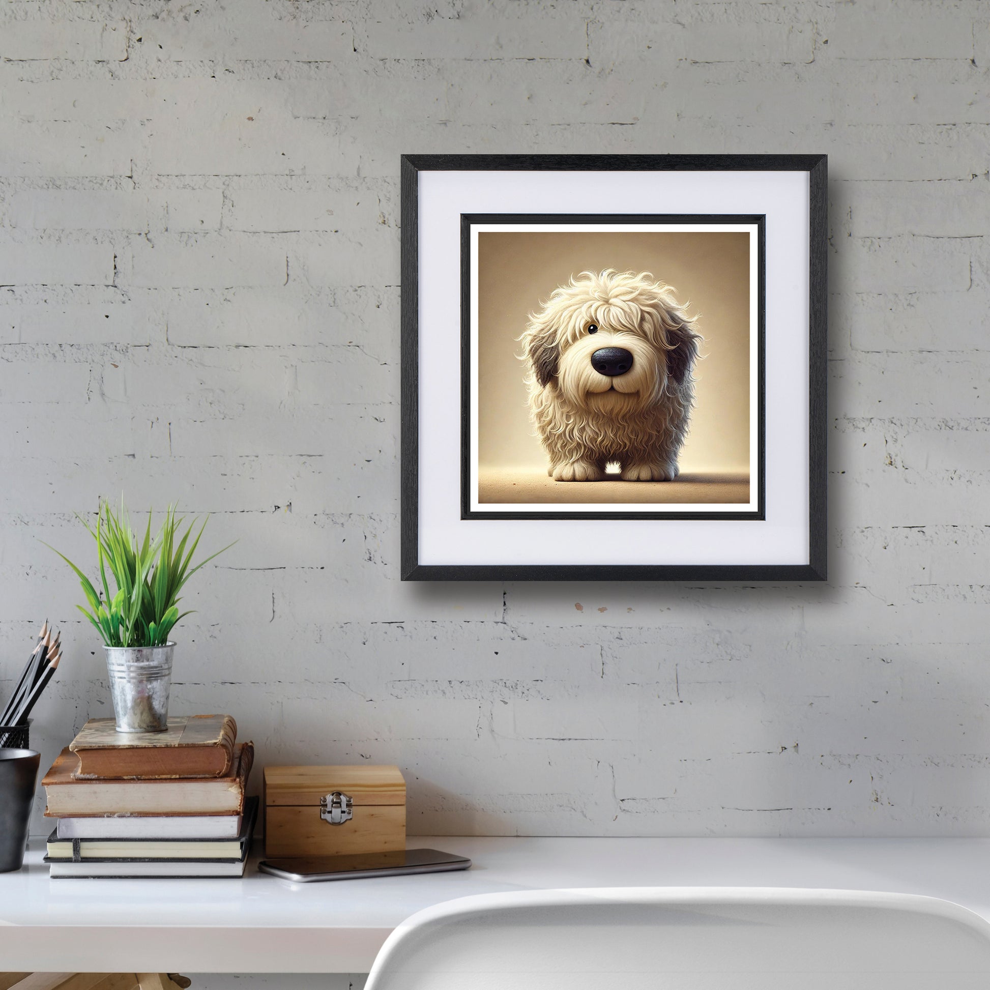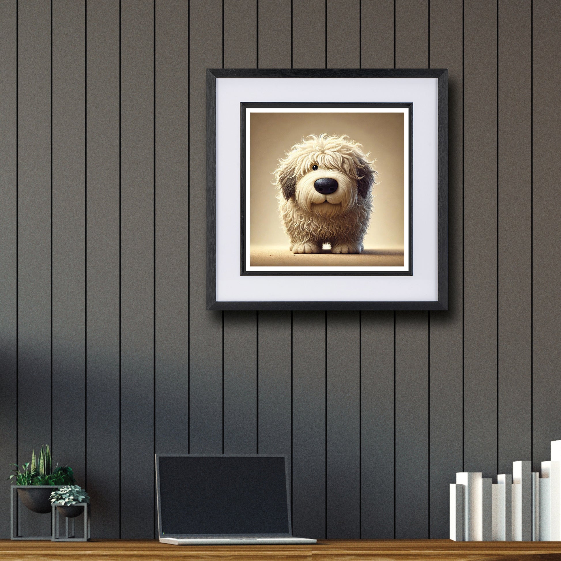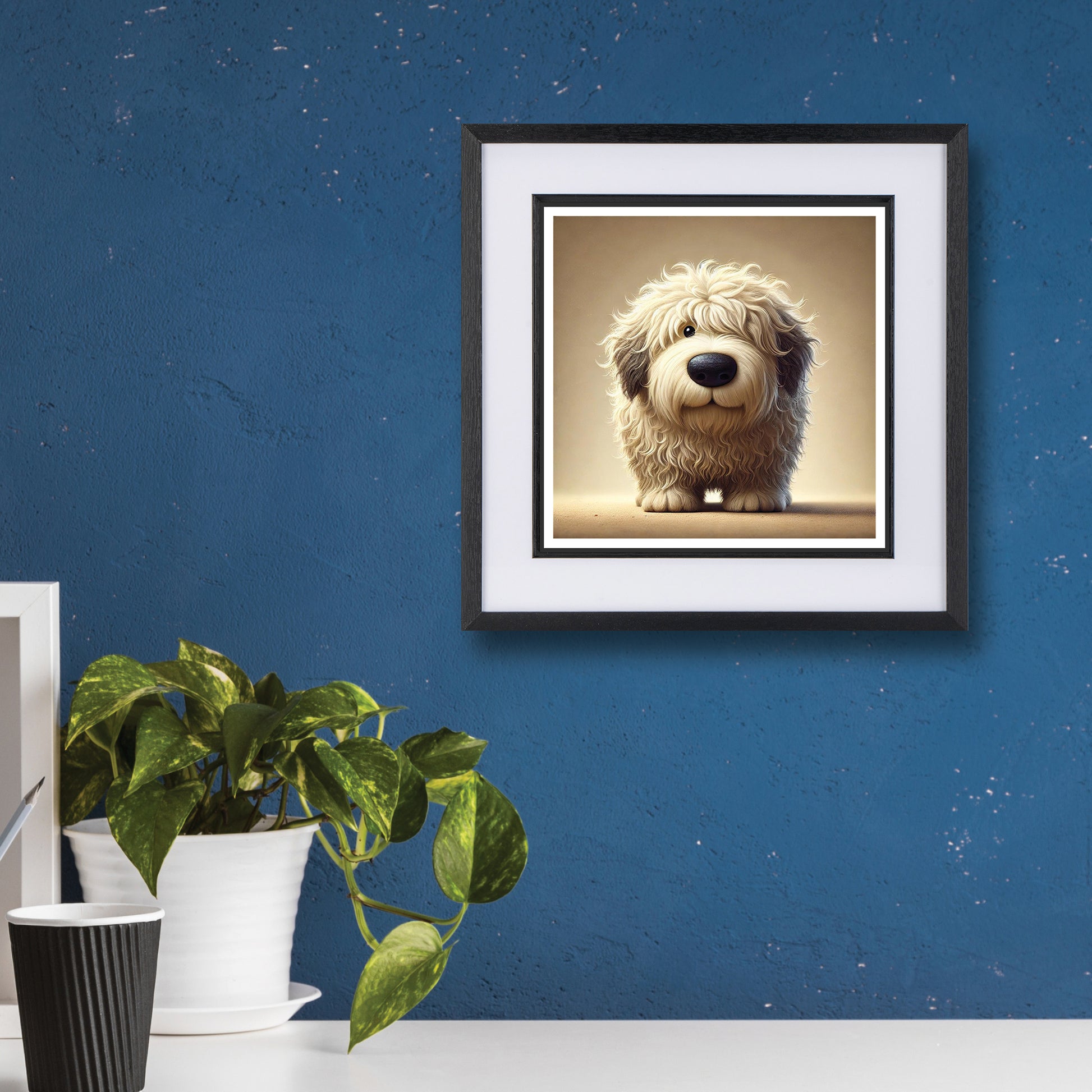 Showcase your passion for dogs with our unique, handcrafted art pieces! “Old English Pirate Dog” features a fluffy Old English Sheepdog with a soft, rounded appearance, almost resembling a plush toy. The dog's thick, curly fur covers much of its face, leaving only its shiny black nose and one eye visible. The artwork's gentle, muted tones and detailed texture create a heart-warming and endearing portrait.