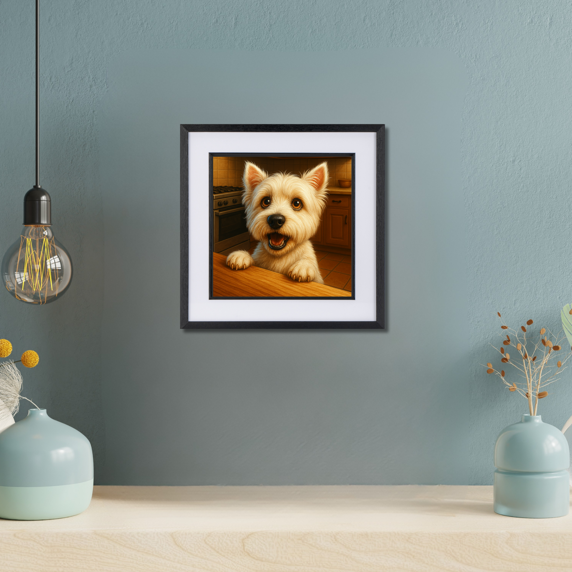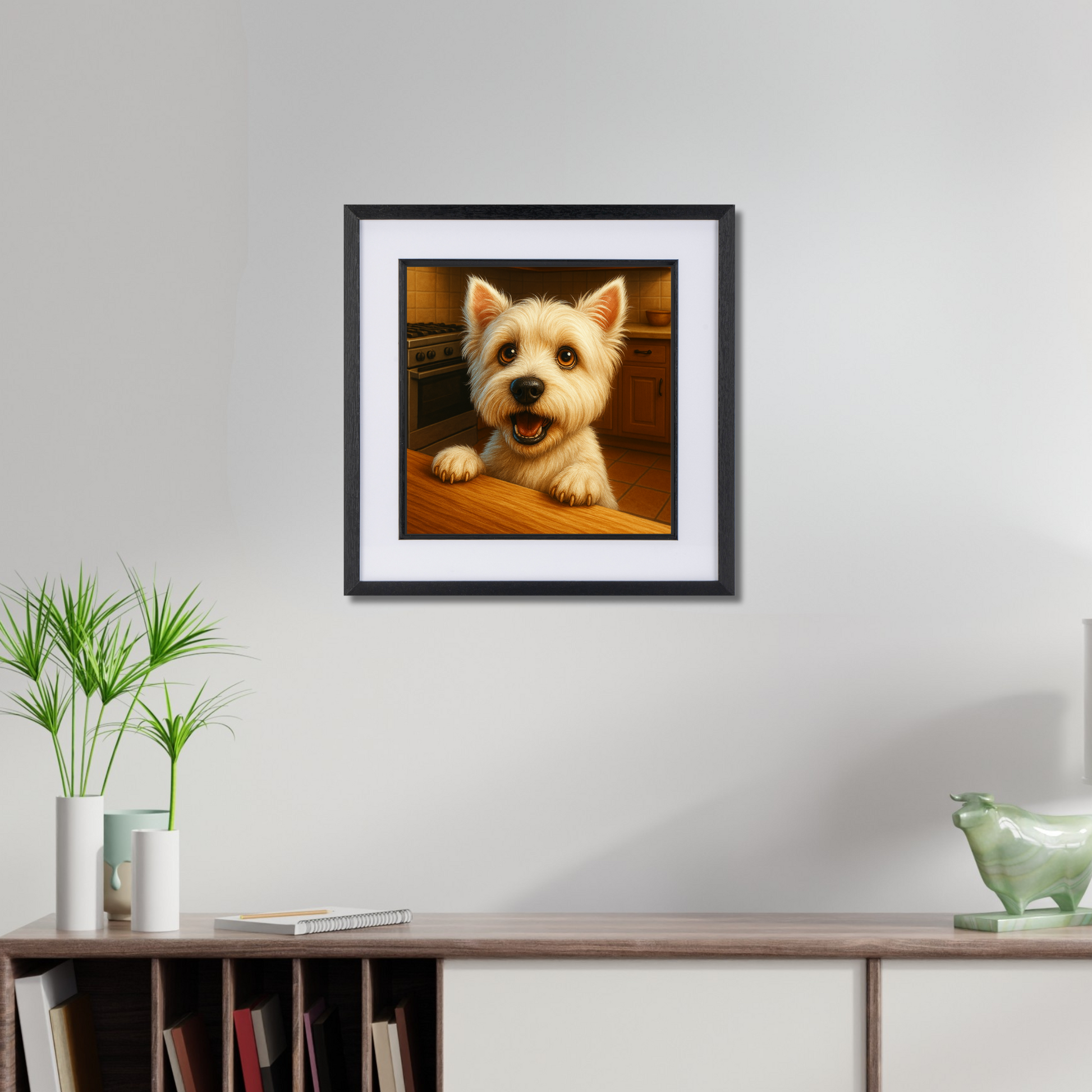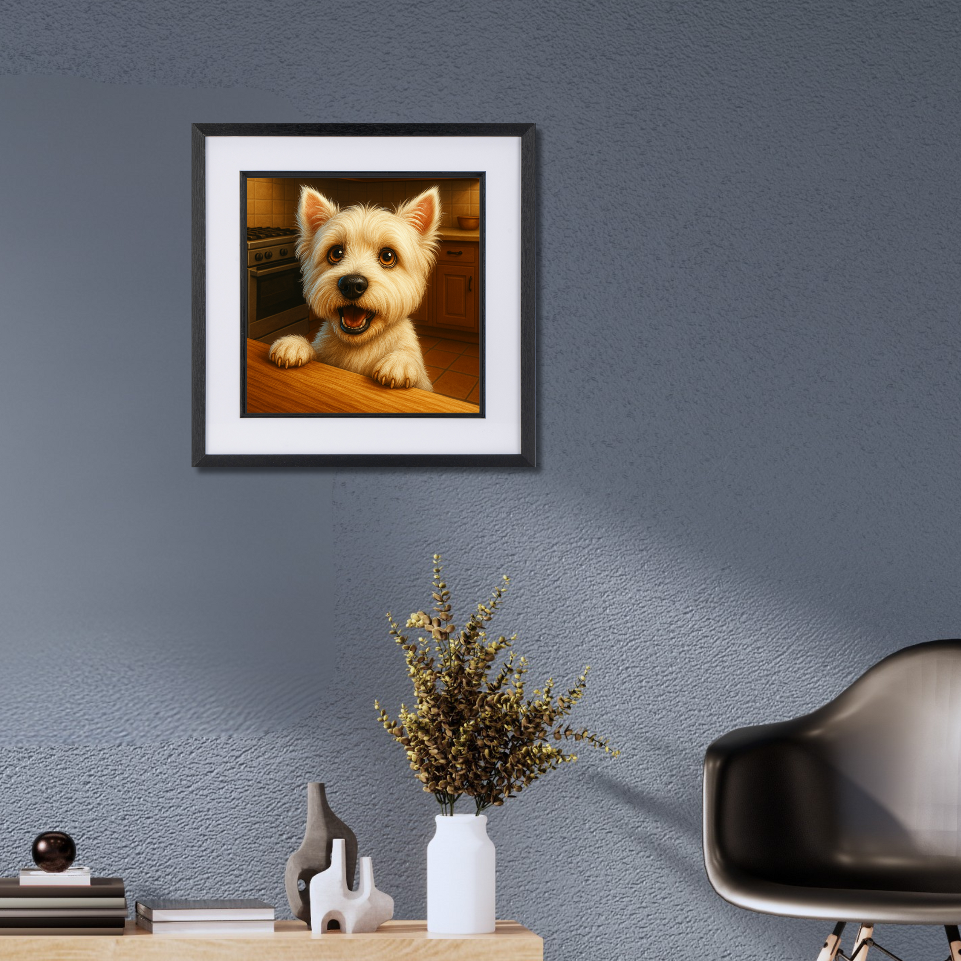With paws on the counter and eyes full of hope, this cheerful Westie isn’t shy about announcing dinnertime. Capturing the classic combo of charm and cheek, this joyful artwork is perfect for kitchens, breakfast nooks, or anywhere food meets furry enthusiasm. A must-have for West Highland Terrier lovers and fans of playful, food-themed dog decor.