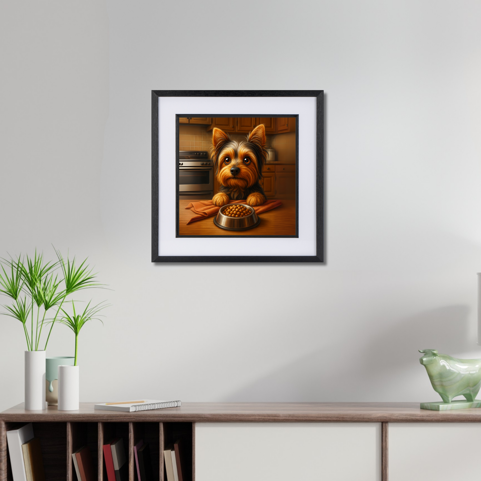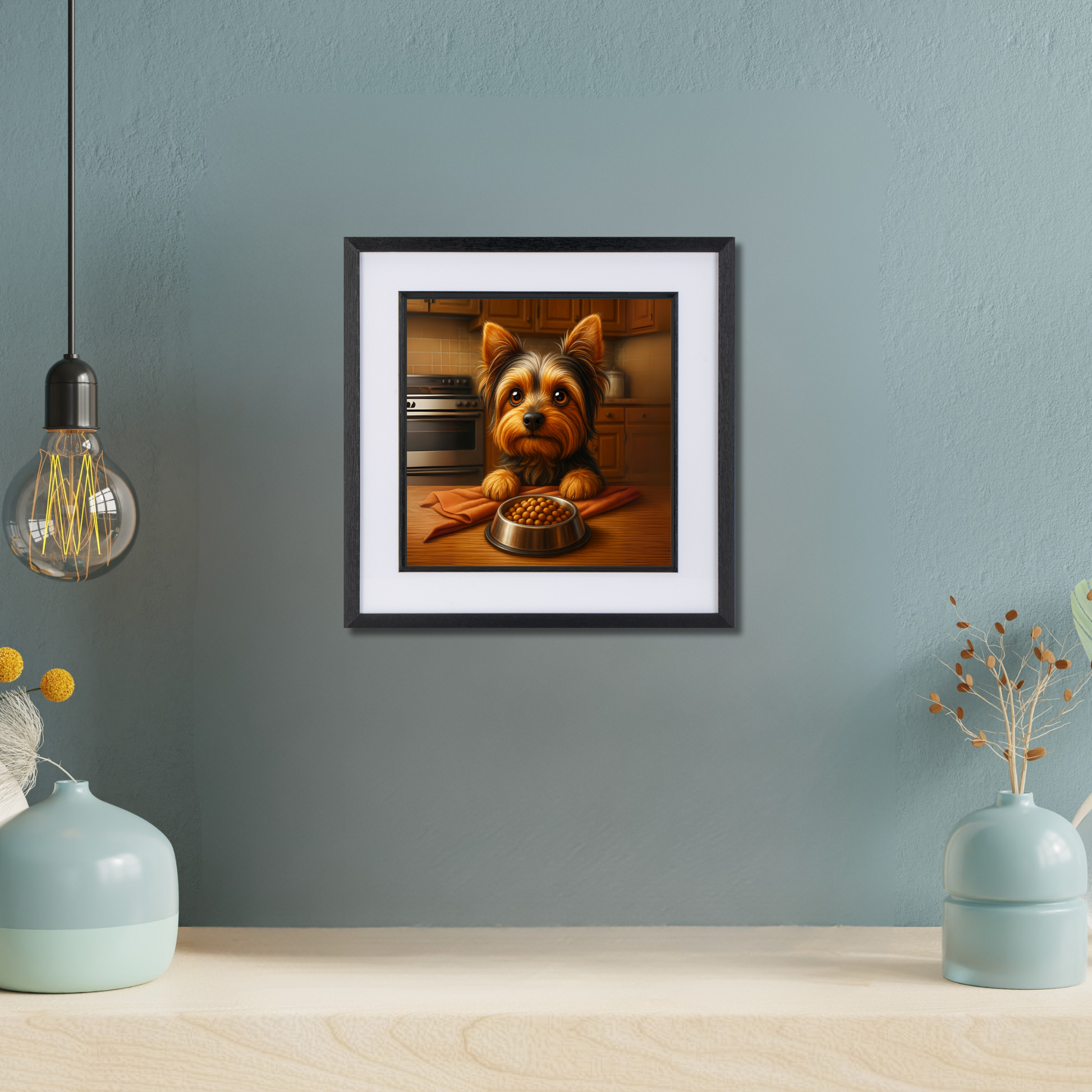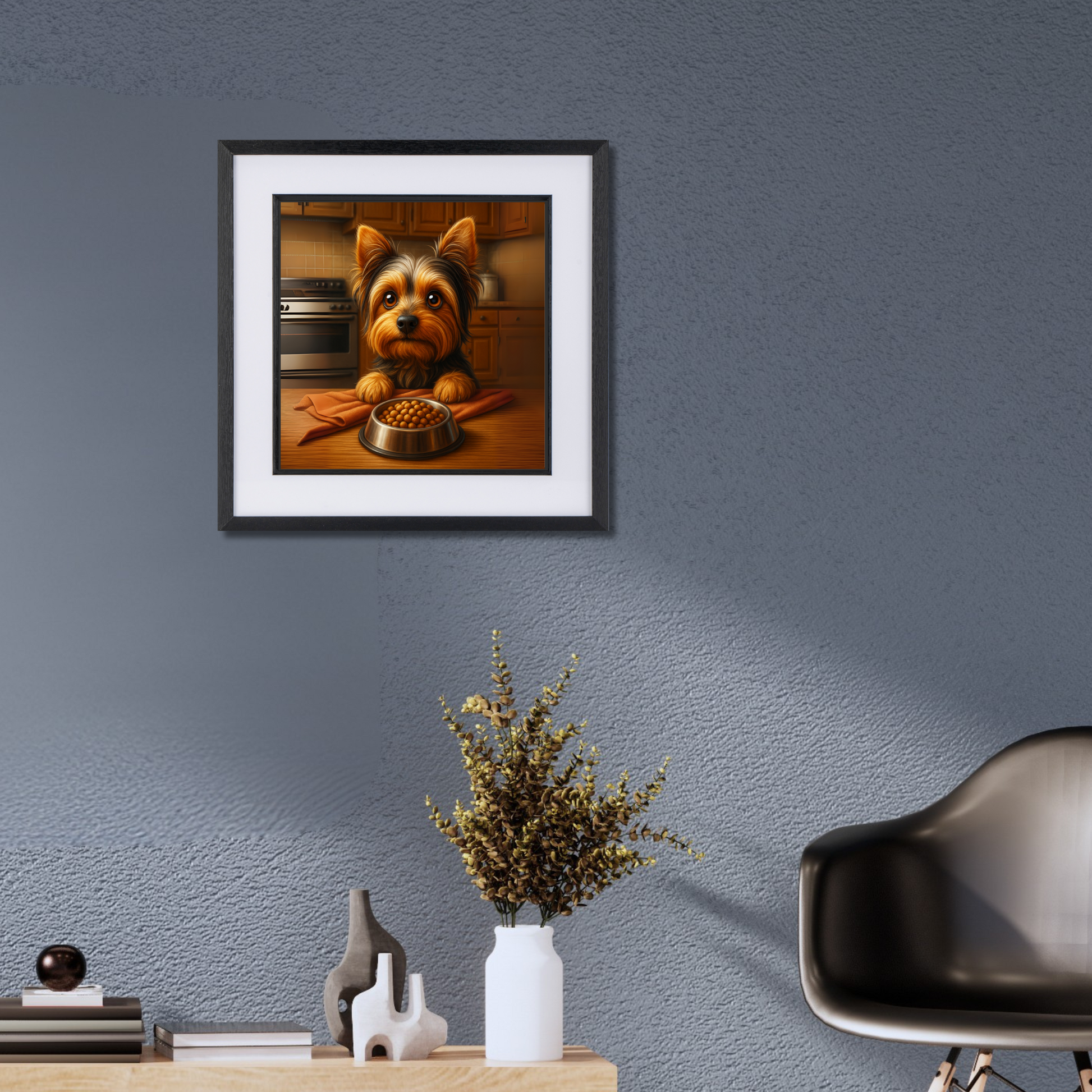 This charming Yorkshire Terrier may be tiny—but their table manners are a work in progress. With wide eyes and fluffy paws hovering dangerously close to dinner, this delightful artwork adds a dose of humour and heart to any kitchen or dining space. A perfect gift for Yorkie lovers and anyone who knows the daily drama of dinner with dogs.