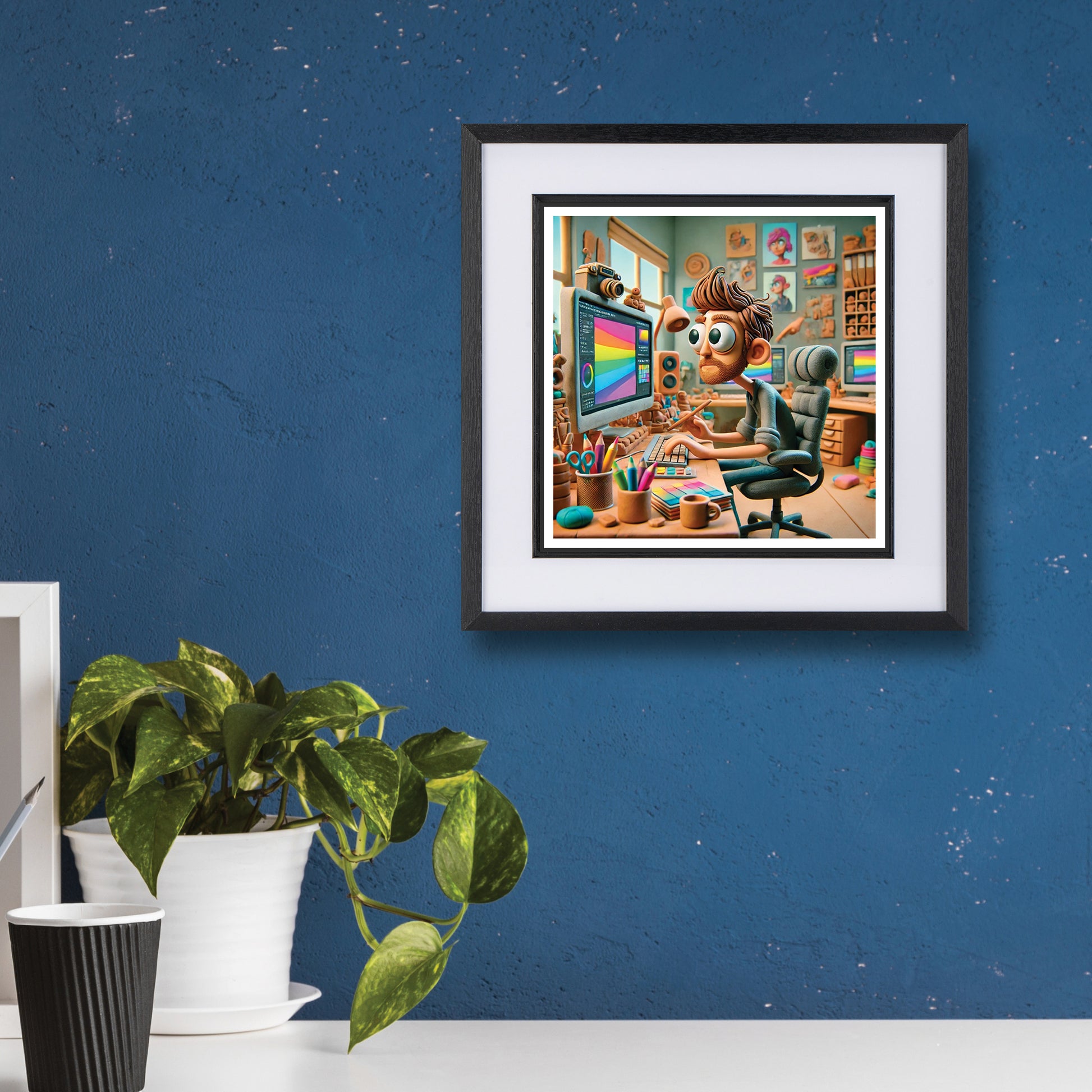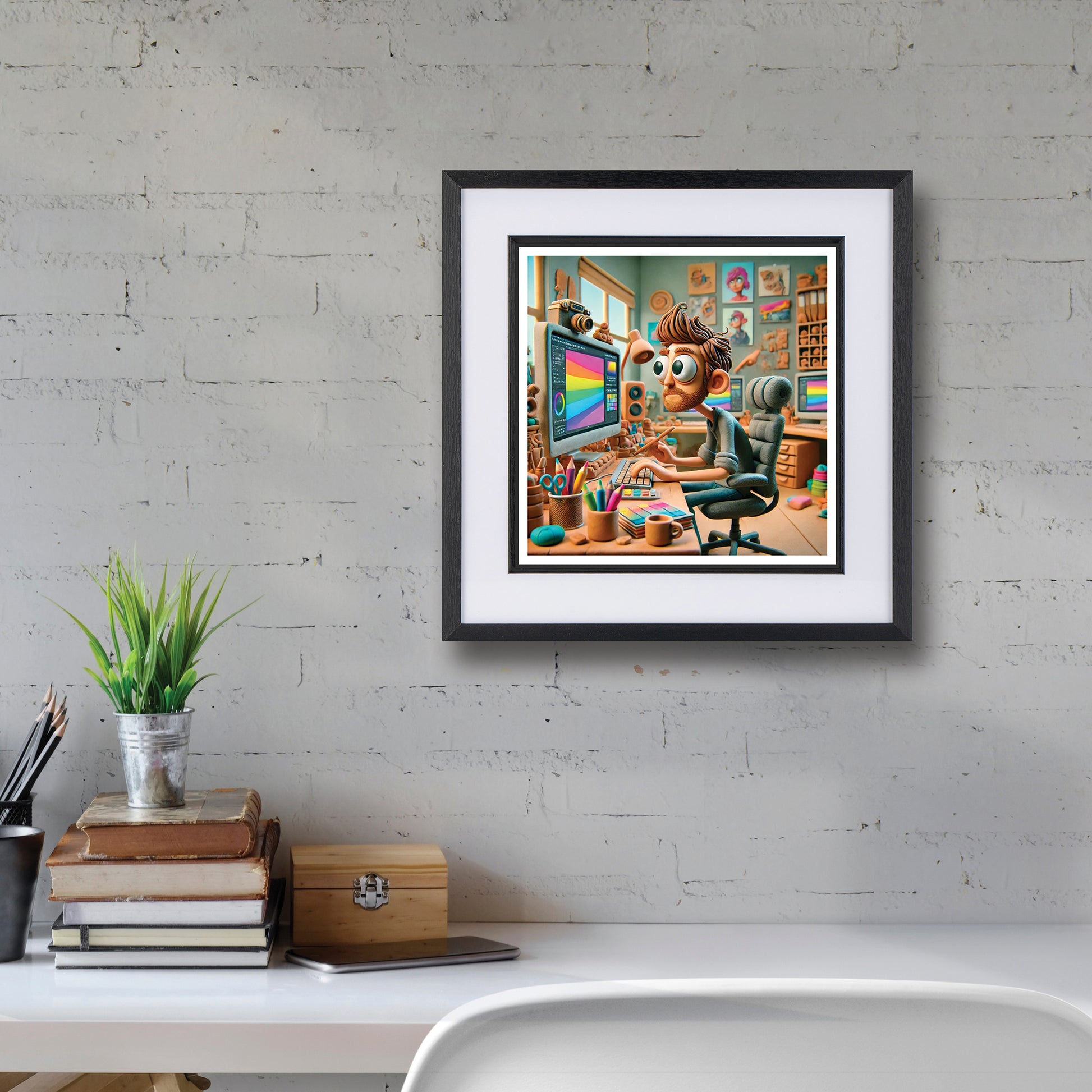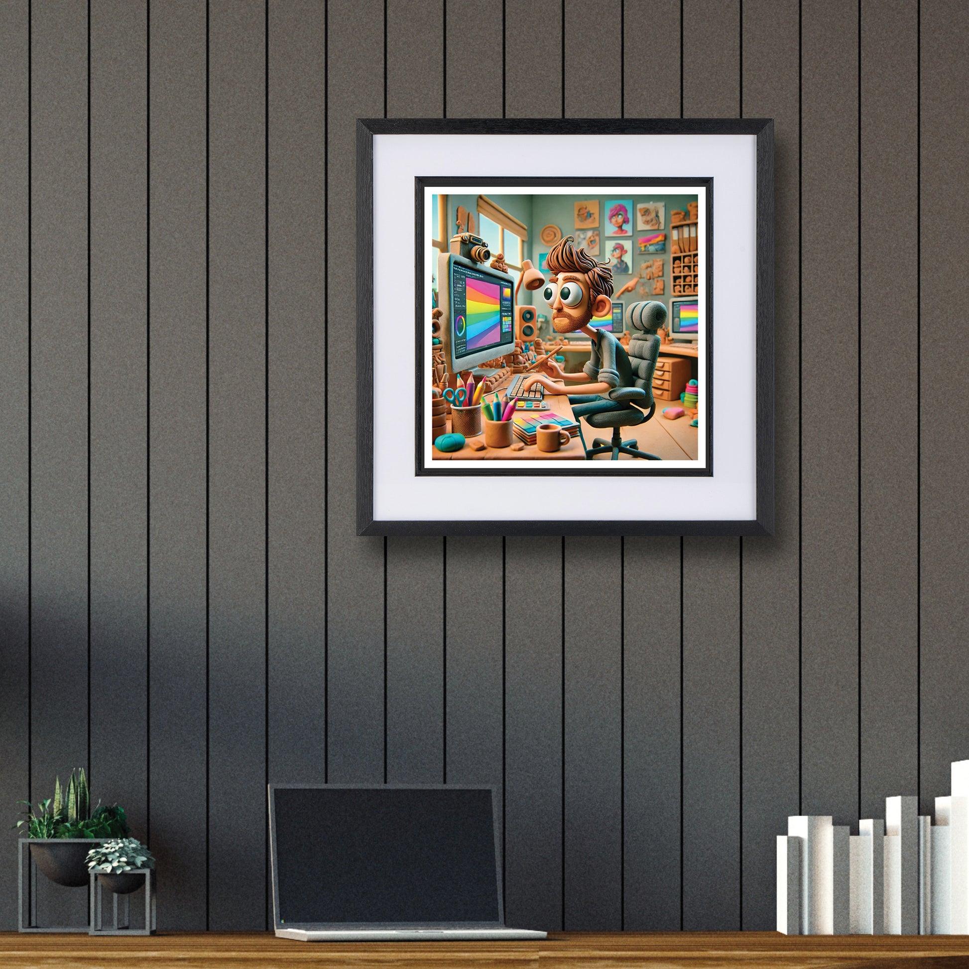 The ideal gift for anyone who appreciates unusual, quirky, and one-of-a-kind artwork. "Pixel Police" shows a graphic designer deeply focused on his work in a creative studio. Surrounded by colorful designs and digital tools, this image highlights the dedication and passion that drives the world of graphic design.