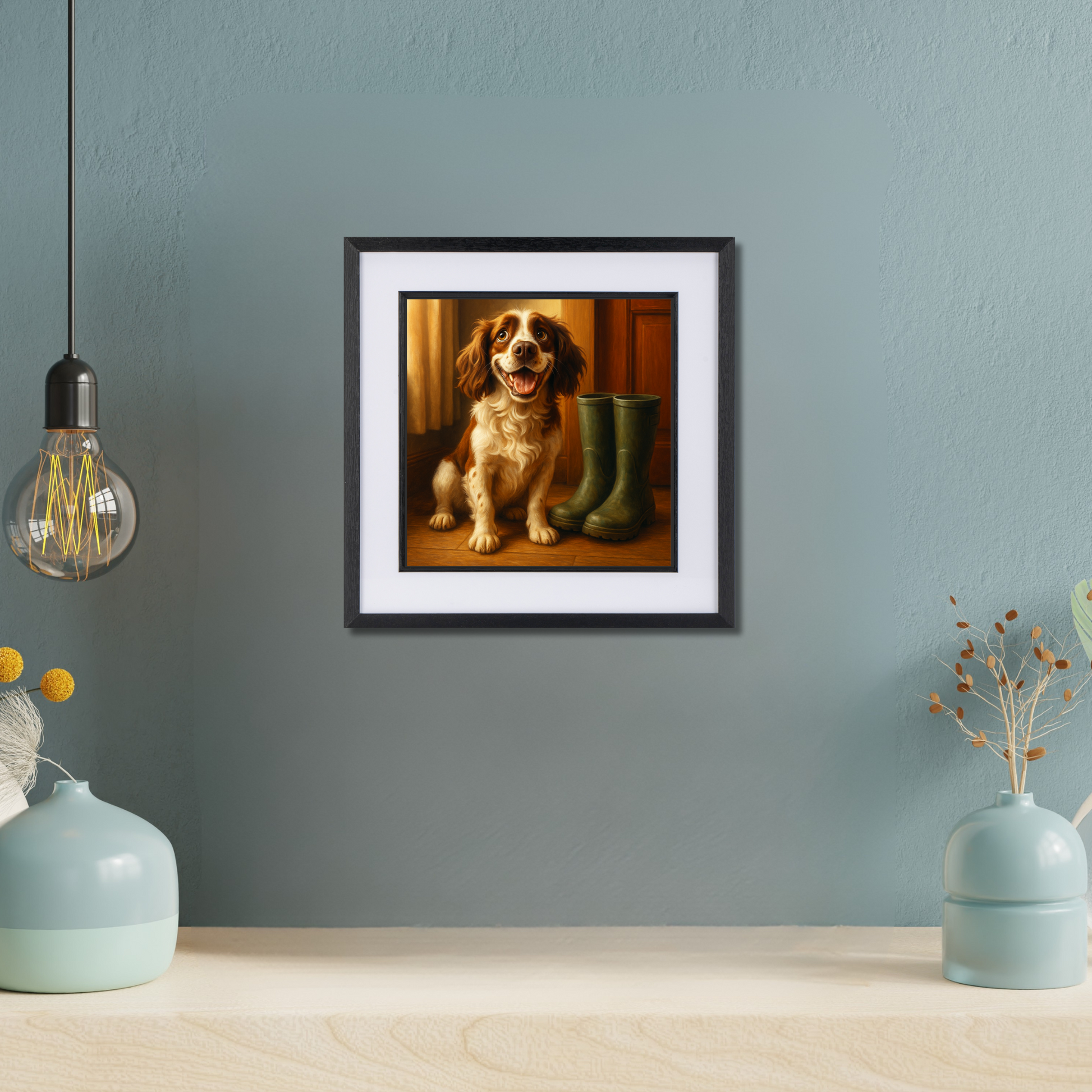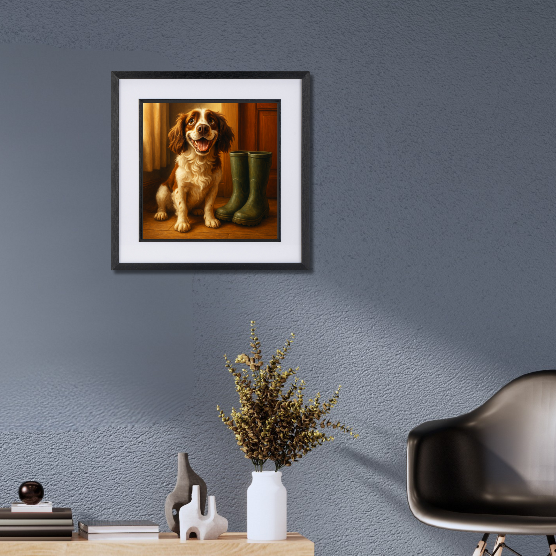 Ready, wagging, and waiting by the door—this joyful Springer Spaniel artwork captures that electrifying moment just before the walk begins. With a wide grin and eager eyes beside a trusty pair of wellies, it's a heartwarming tribute to every adventure-loving pup. Perfect for hallways, boot rooms, or dog-friendly homes, this print is a must-have for Springer Spaniel fans and countryside dog lovers alike.