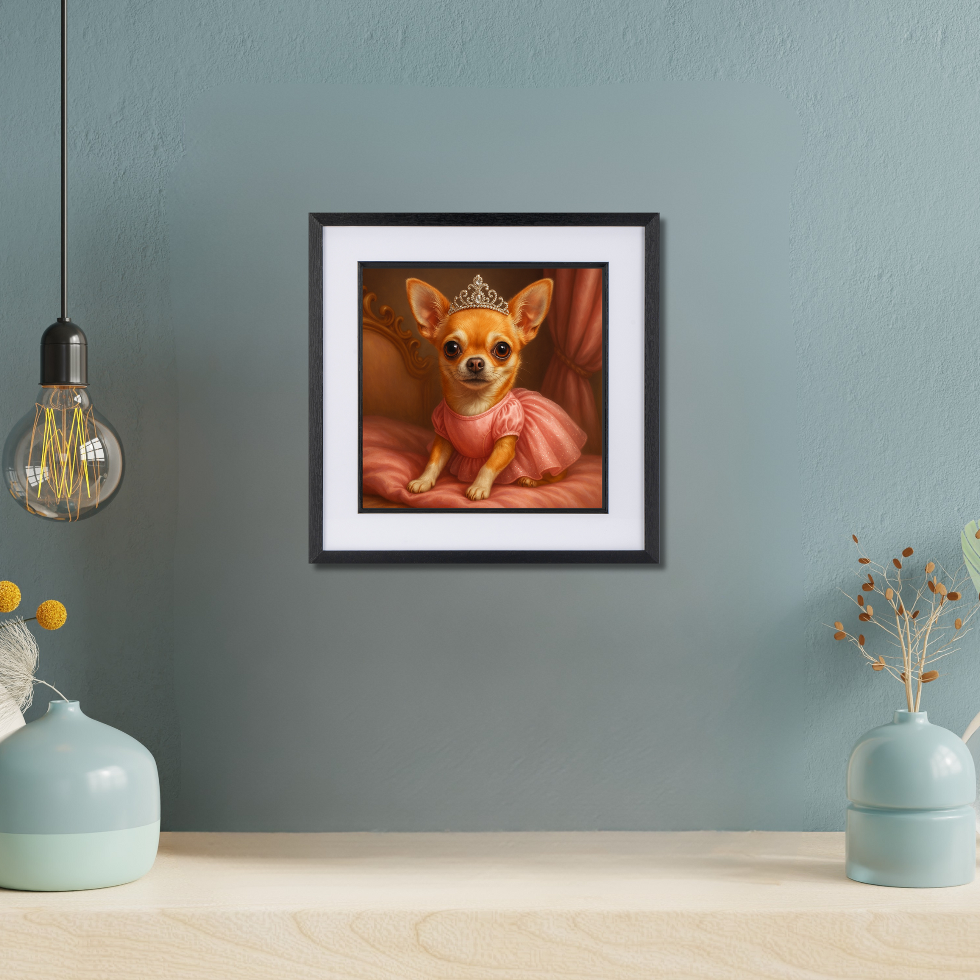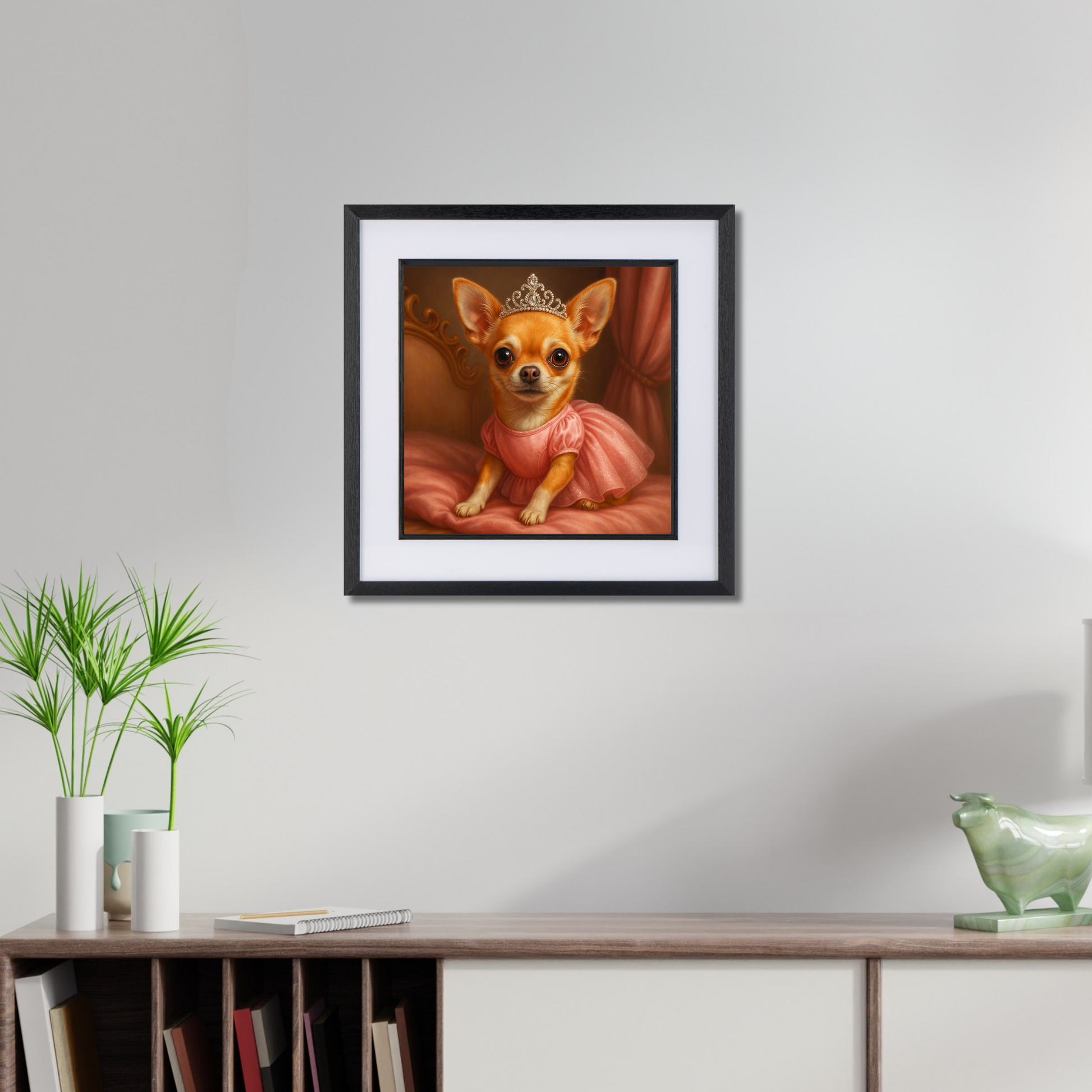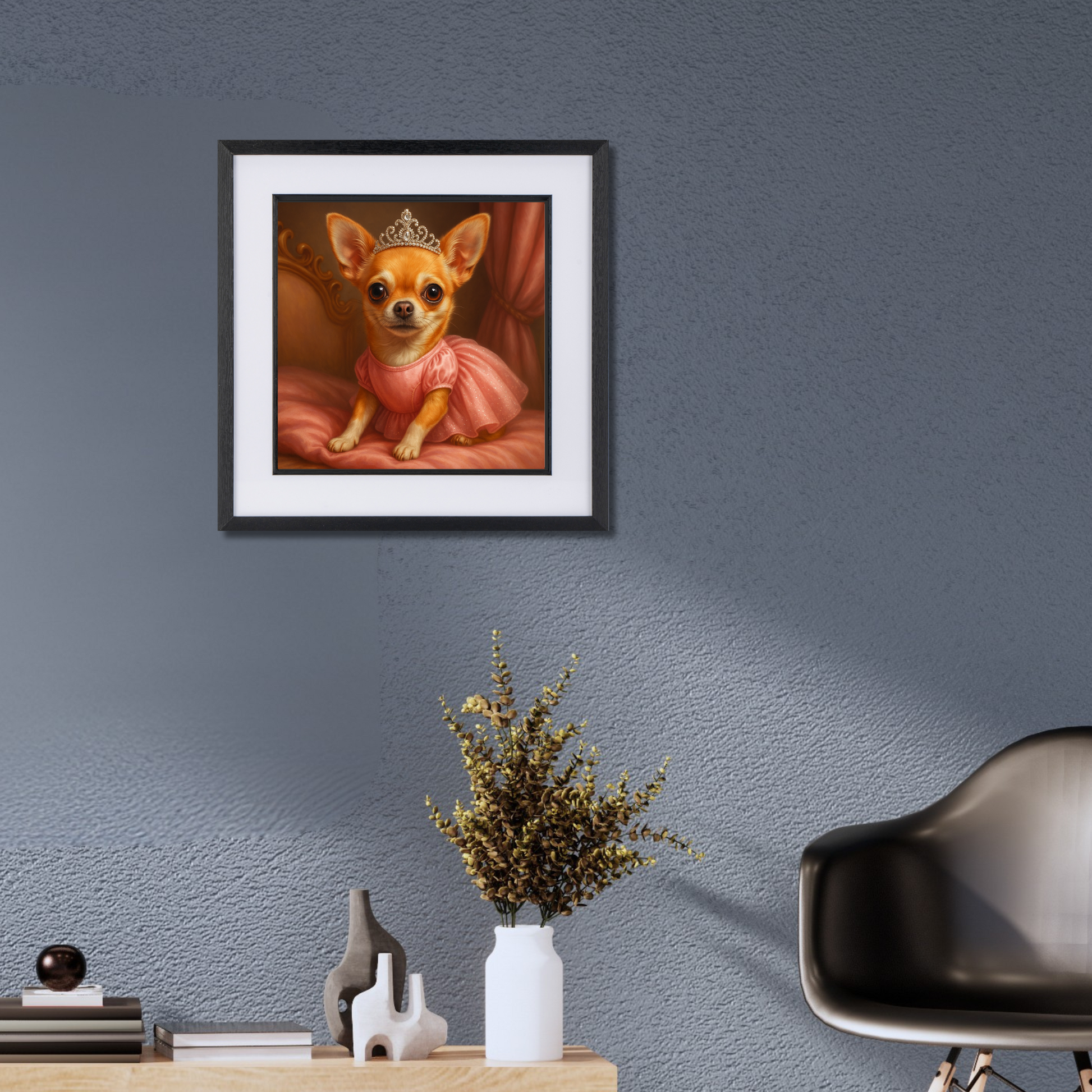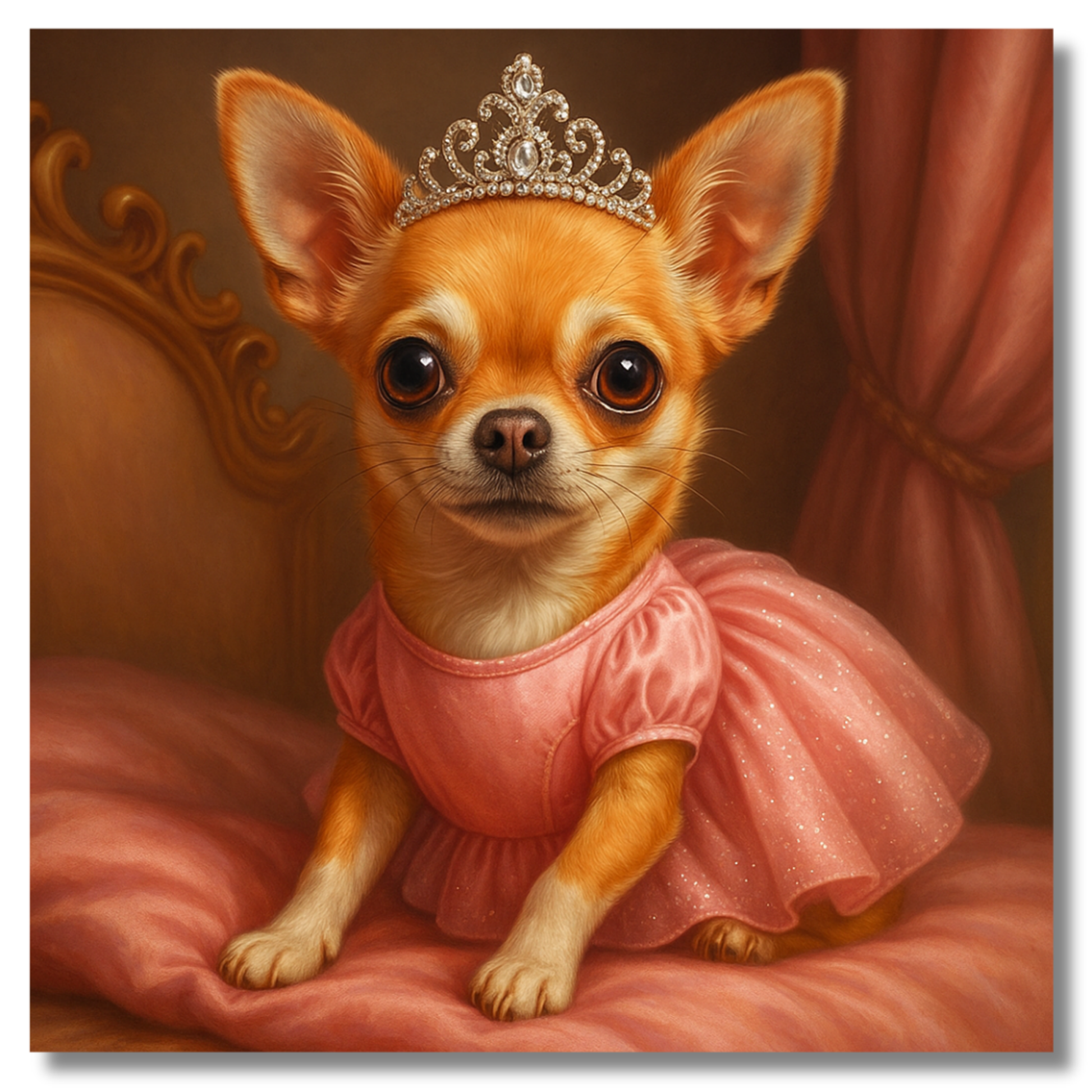 All hail the tiniest royal of them all! Dressed in a sparkly pink gown and glittering tiara, this glamorous Chihuahua artwork is full of charm, sass, and sparkle. Perfect for dressing rooms, nurseries, or anyone who treats their dog like absolute royalty. A must-have for Chihuahua lovers and fans of fabulous dog wall art with a playful, pampered twist.