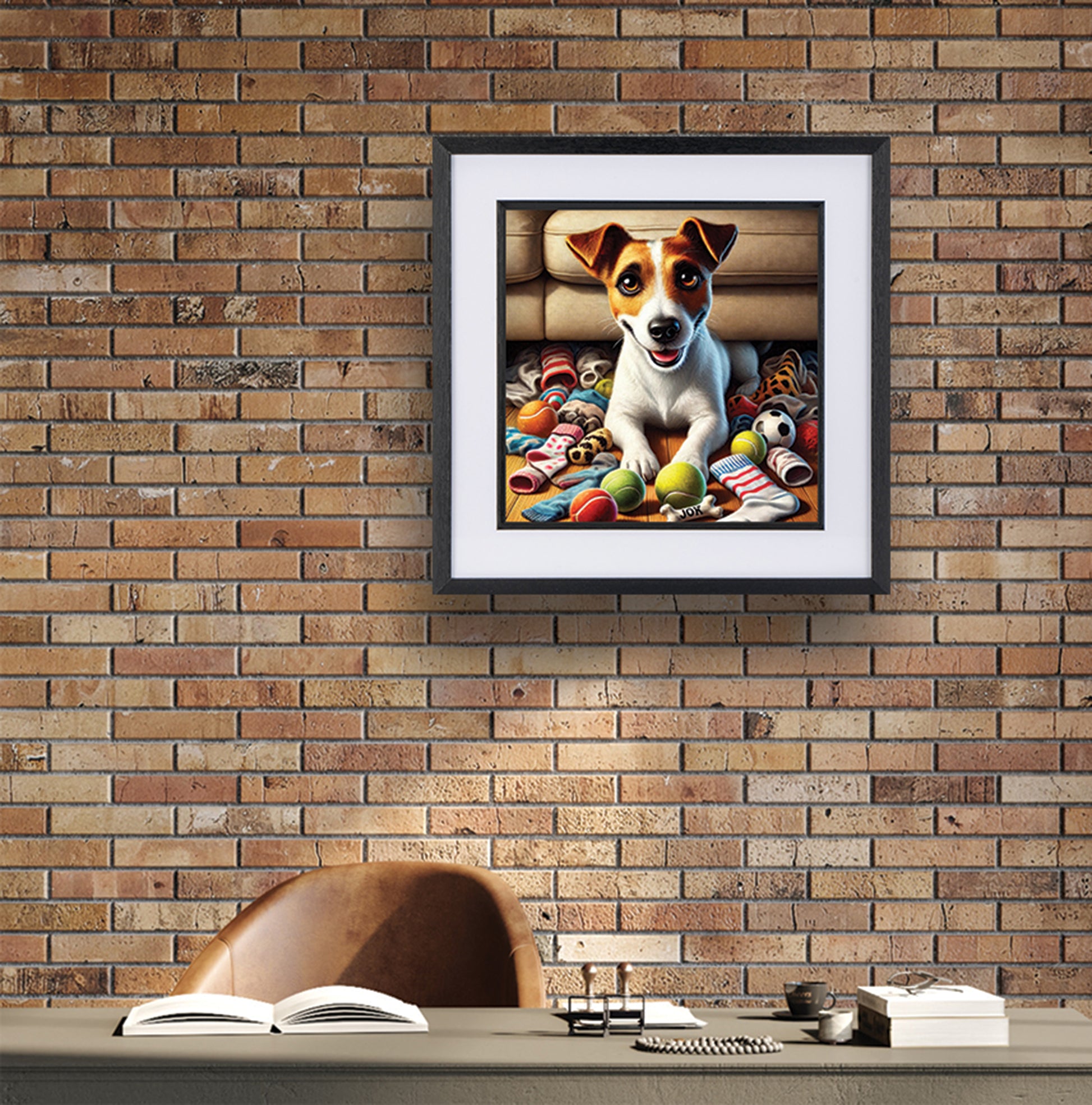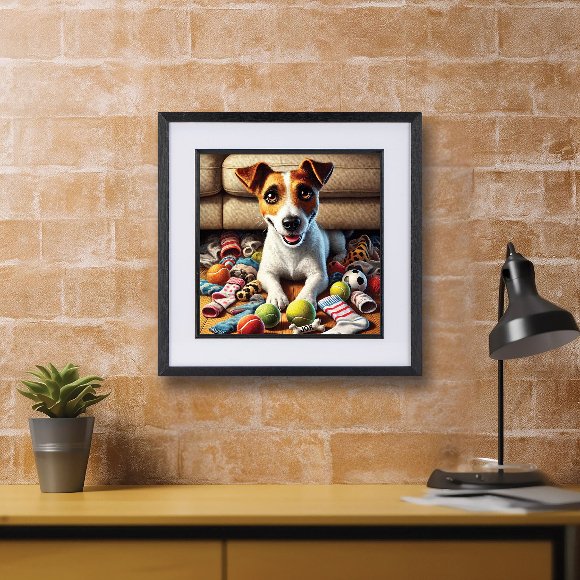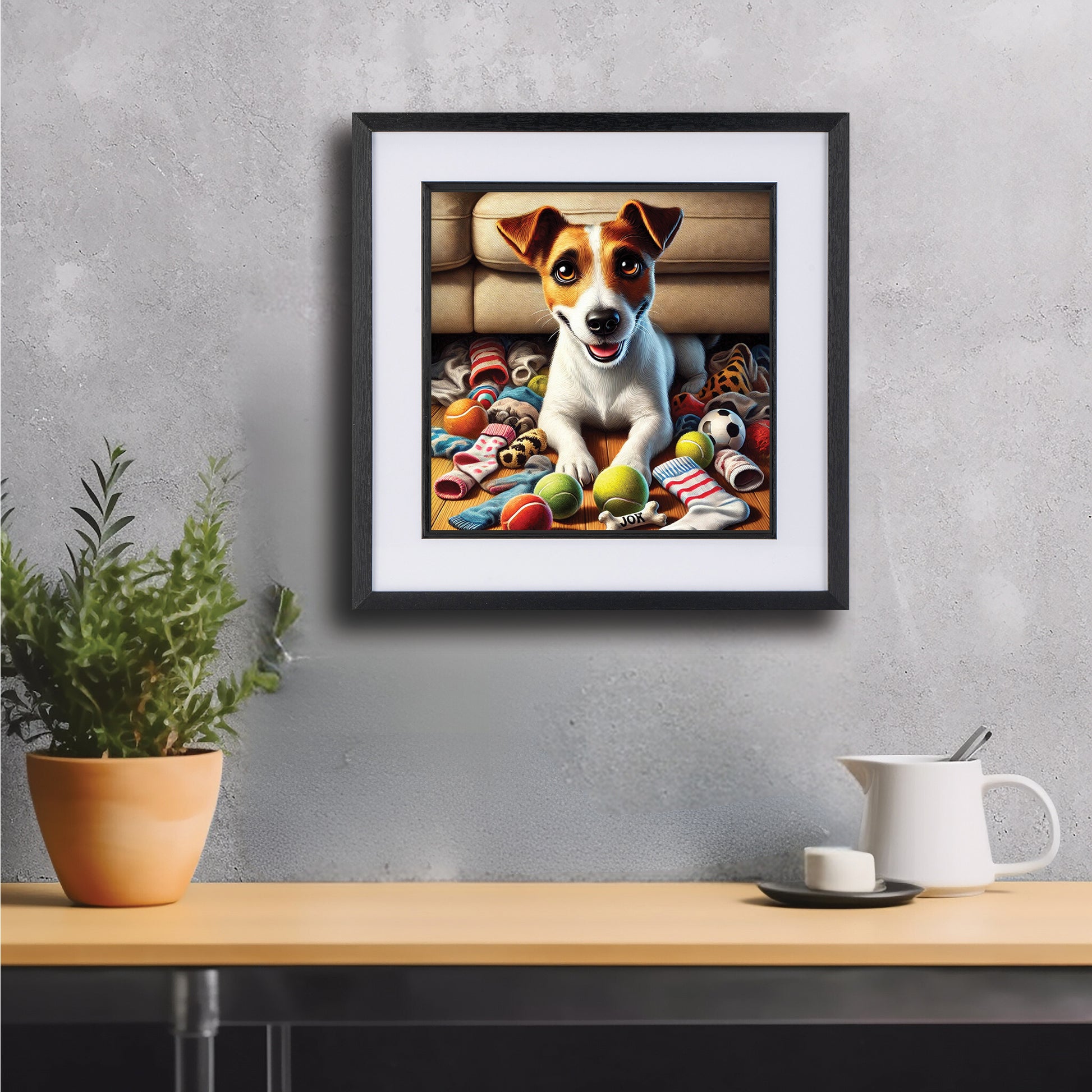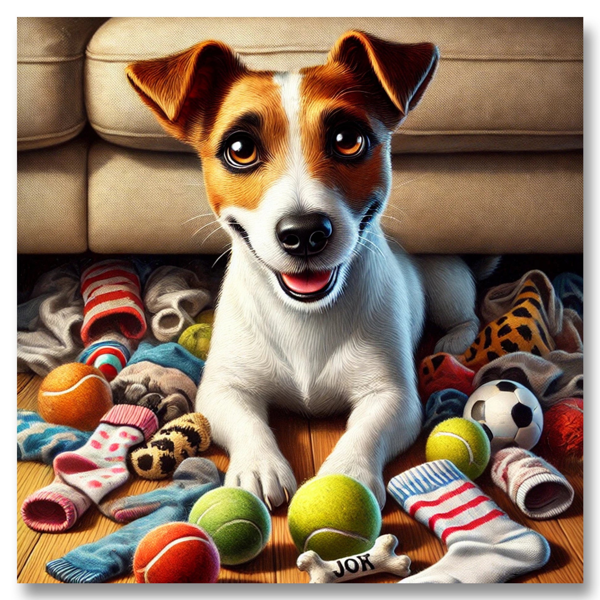Delight the dog lover in your life with stunning artwork they'll adore! Sitting proudly among a pile of toys and stolen socks, this Jack Russell has no shame about his Secret Stash! This playful and cheeky Jack Russell artwork perfectly captures the mischievous charm of a little hoarder pup—making it a must-have for Jack Russell lovers and dog owners alike.