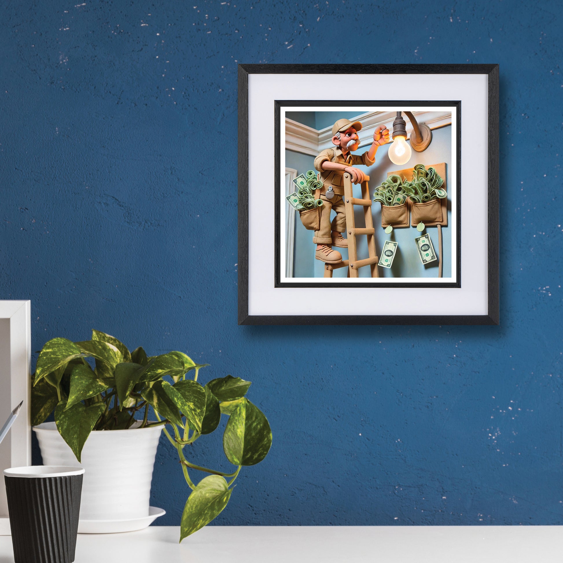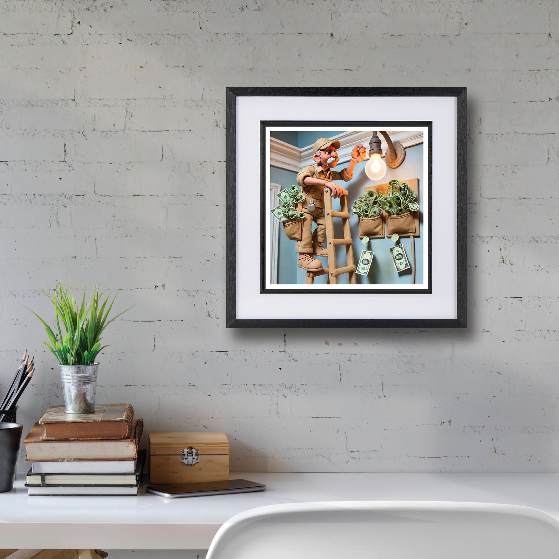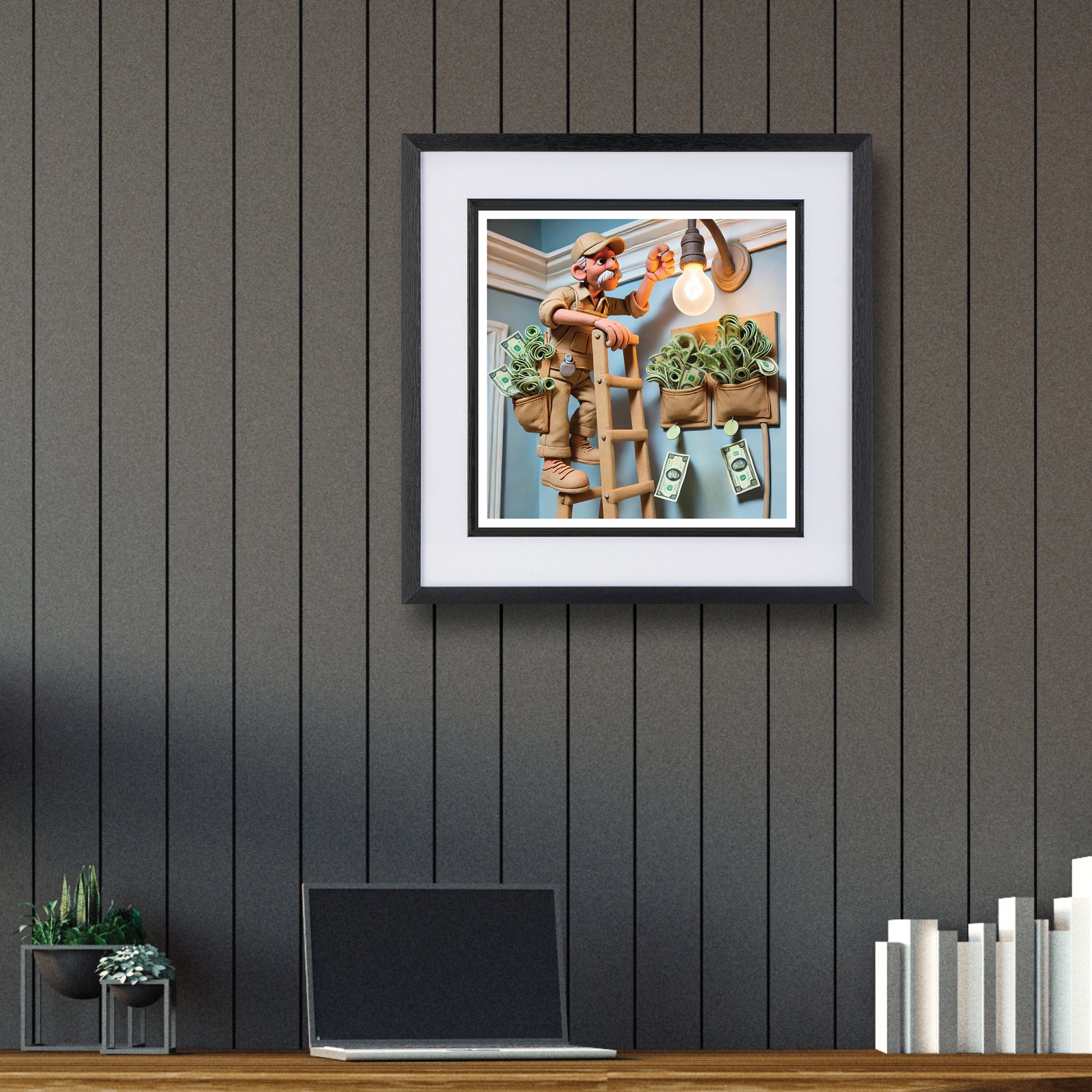The perfect pick for lovers of quirky, distinctive, and completely unique artwork. "Shocking Charges" humorously portrays an electrician on a stepladder changing a light bulb, surrounded by scattered cash that playfully highlights the high prices he charges for his electrical services. This artwork adds a touch of humour to the world of tradesmen.