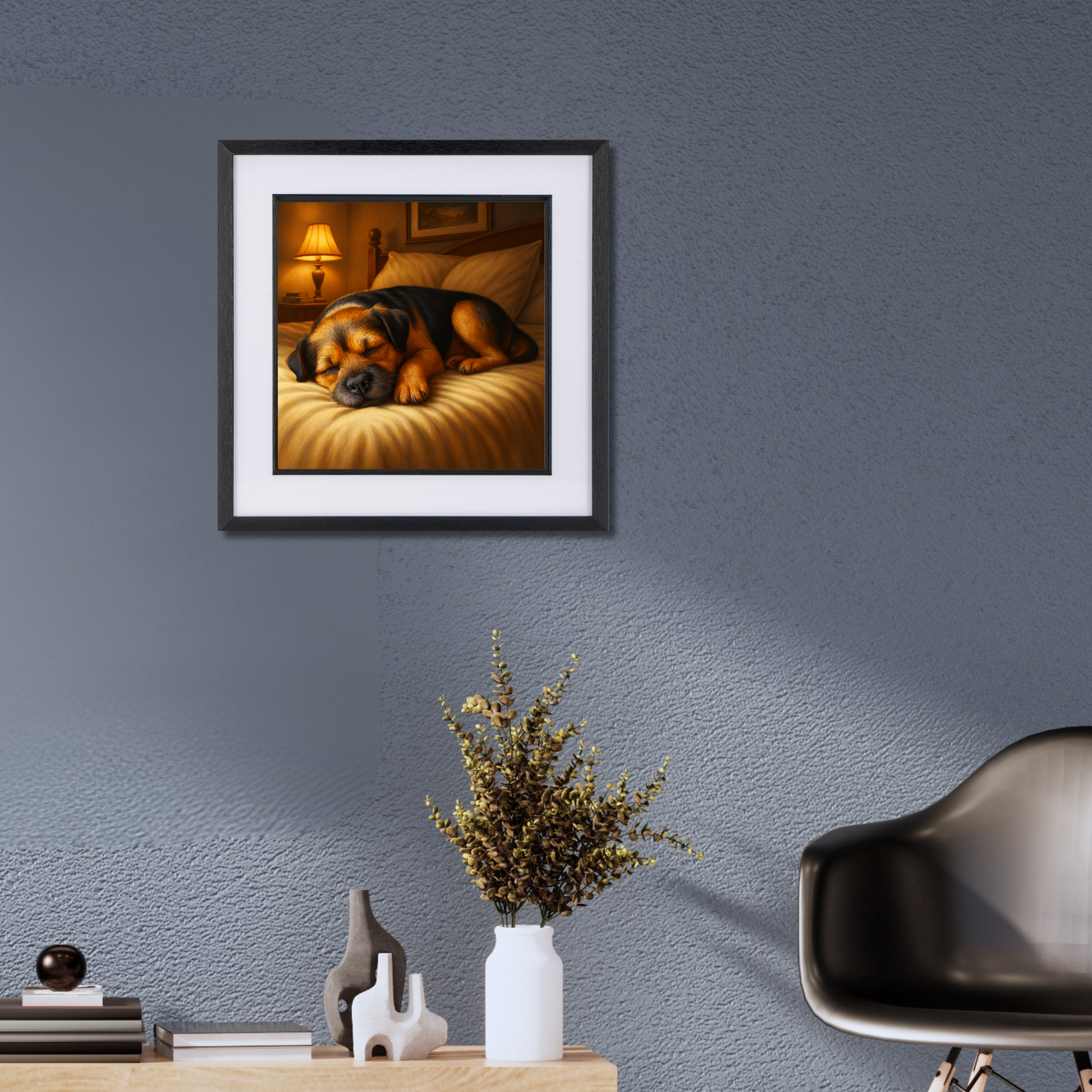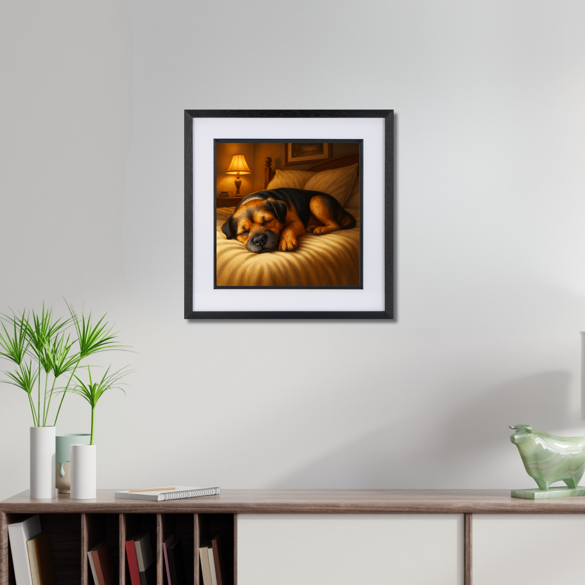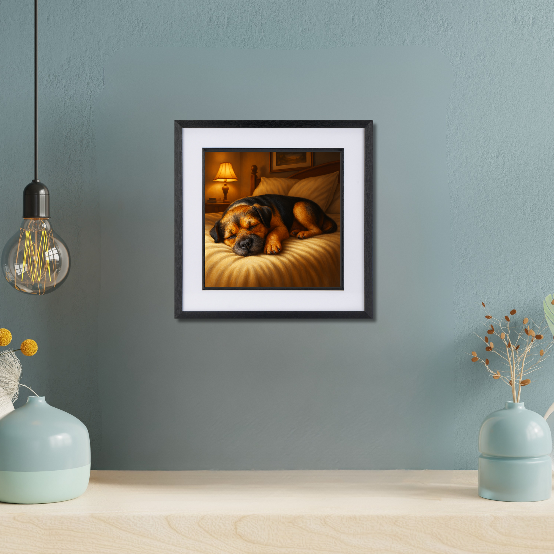 Add a touch of cosy charm to your space with this heartwarming Border Terrier artwork, capturing the ultimate snooze on a freshly made bed. Bathed in soft lamp light and full of sleepy contentment, this piece is perfect for bedrooms, lounges, or dog-friendly spaces. Ideal for lovers of peaceful dog art and Border Terrier prints, it’s a gentle reminder that some moments—especially nap time—are not to be disturbed.