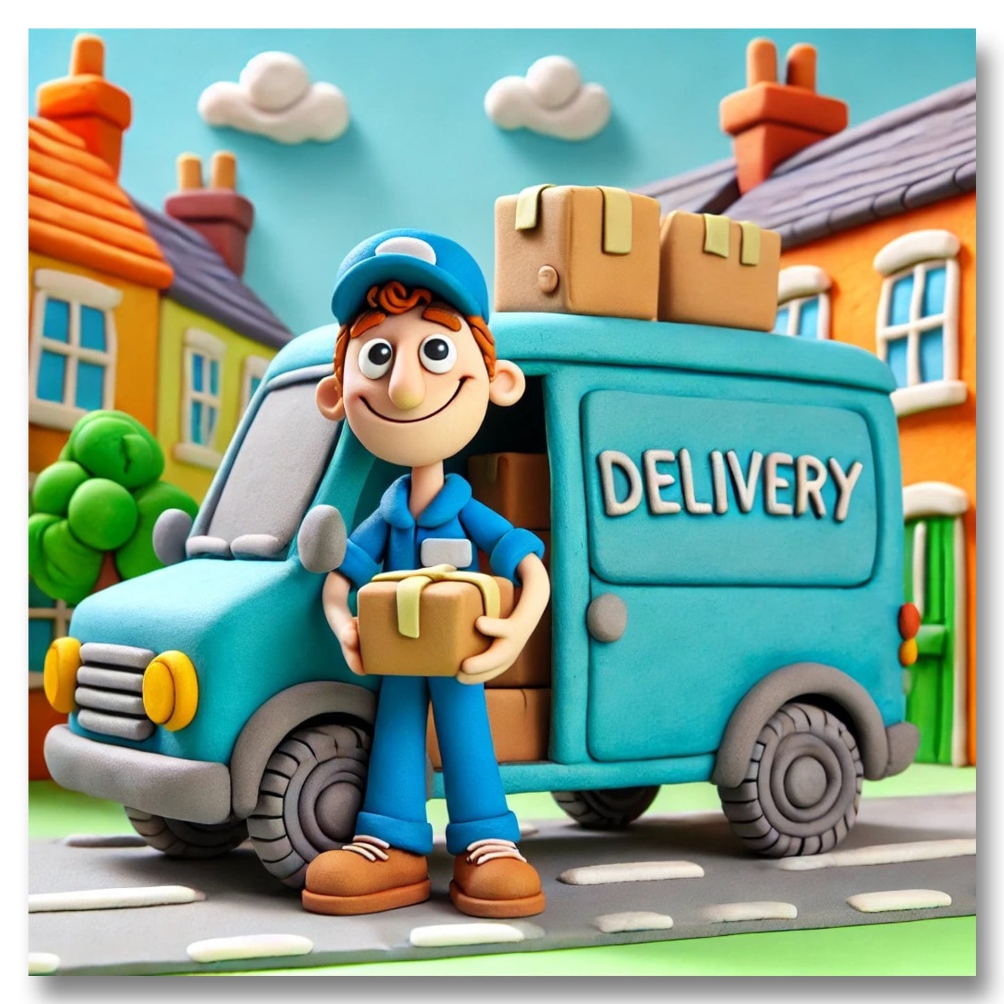 The perfect present for enthusiasts of unconventional, eccentric, and eye-catching art. "The Last Mile" features a courier delivering a parcel with a friendly smile, showcasing the final steps of the delivery journey. This image captures the dedication and personal touch that couriers bring, ensuring every package reaches its destination with care.