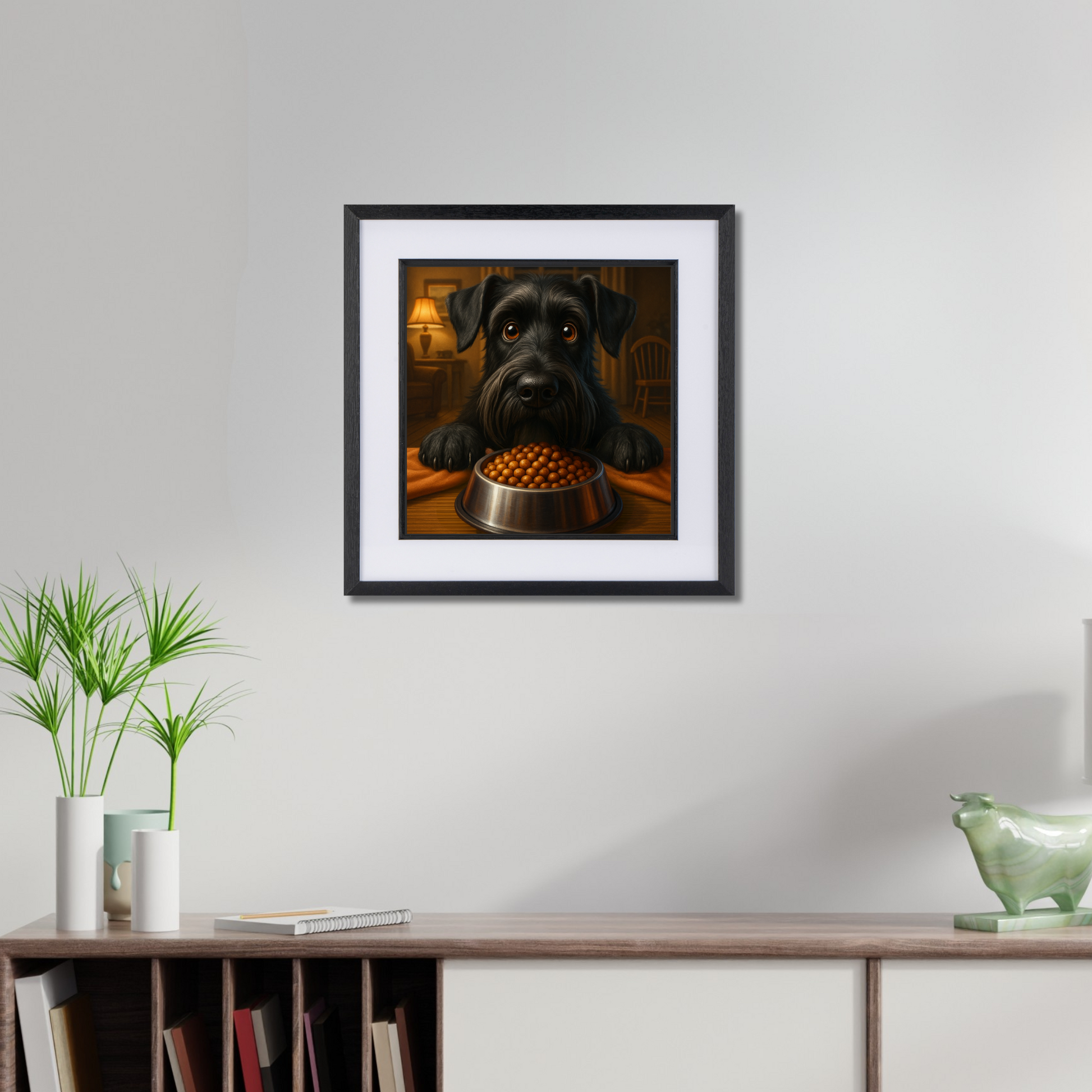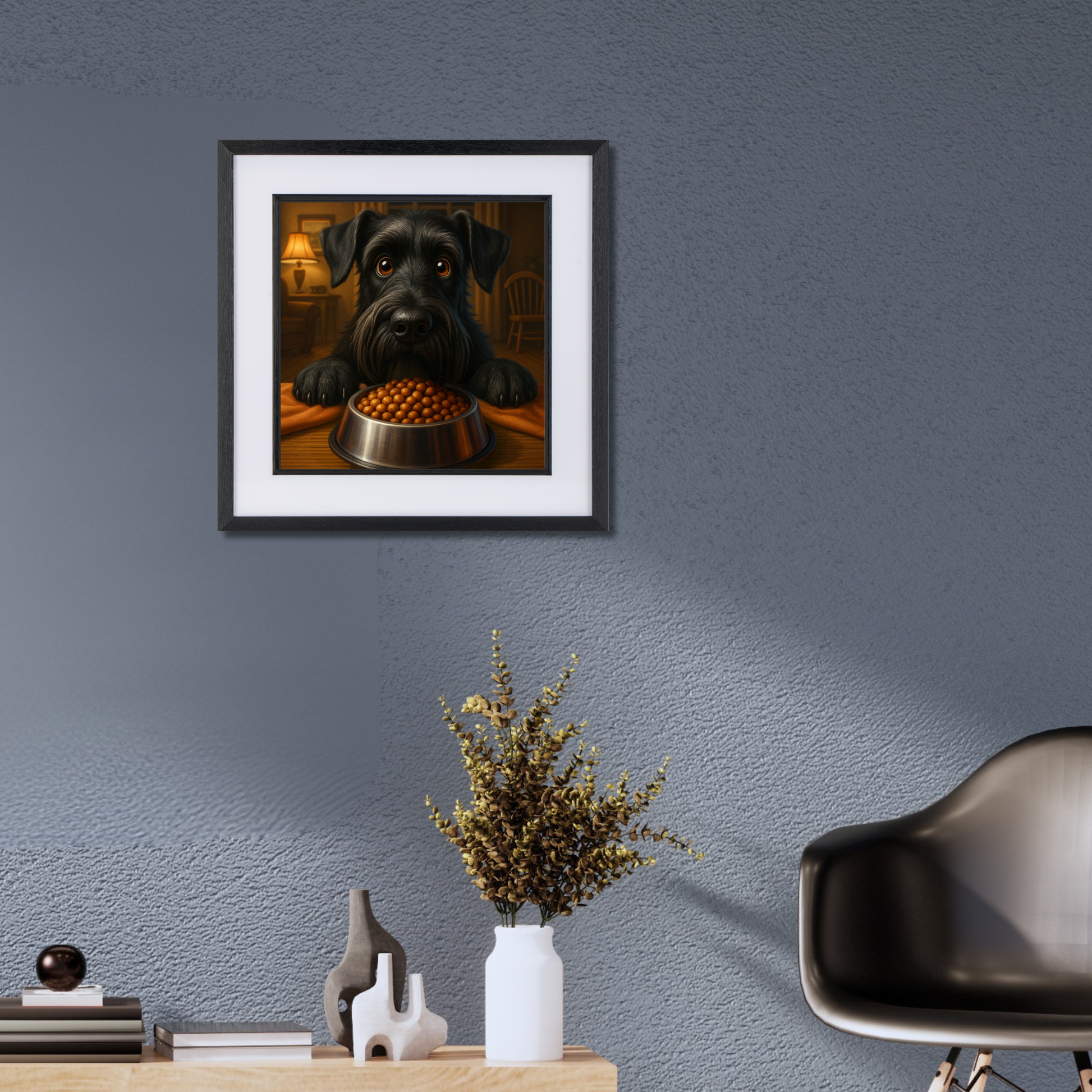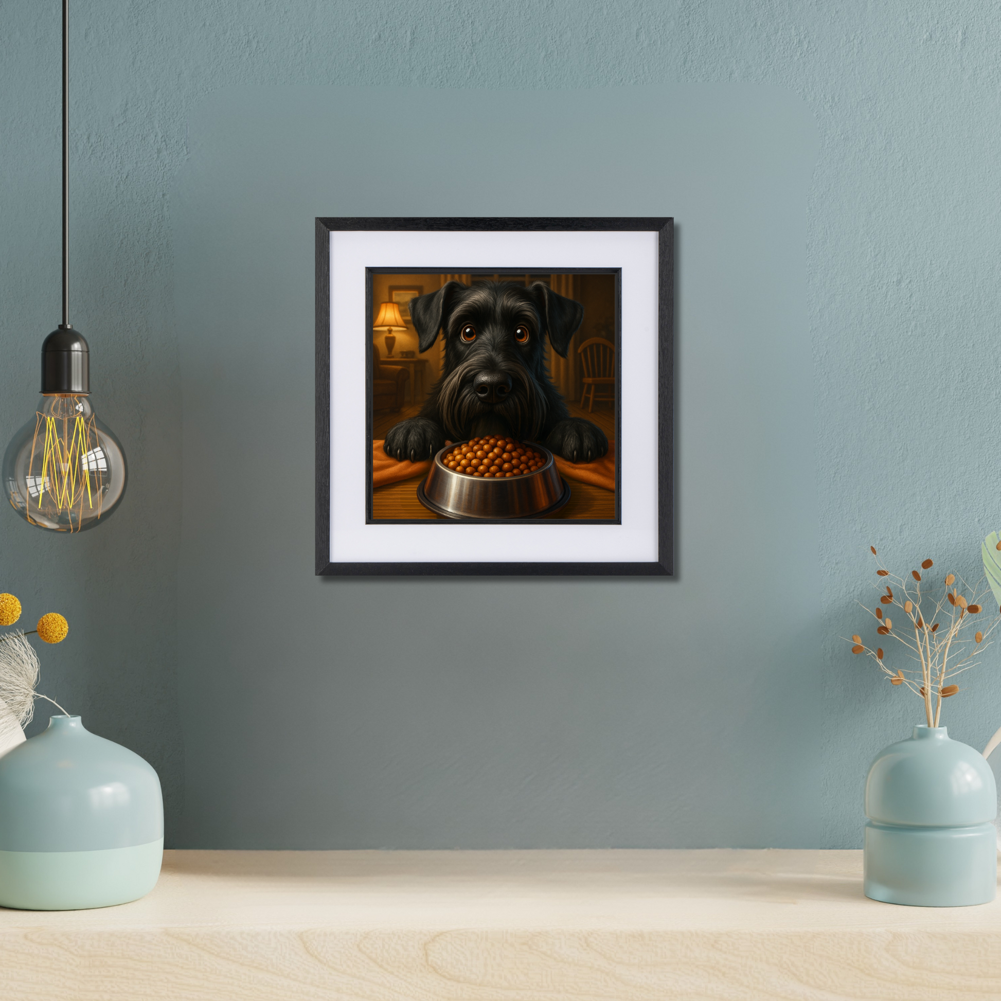 Don’t even think about touching it—this Schnauzer means business. With a bowl full of kibble and eyes full of drama, this hilarious artwork captures the intense bond between dog and dinner. Perfect for kitchens, dining rooms, or anywhere that appreciates a bit of mealtime theatre. A must-have for Schnauzer lovers and fans of funny dog wall art with a side of attitude.
