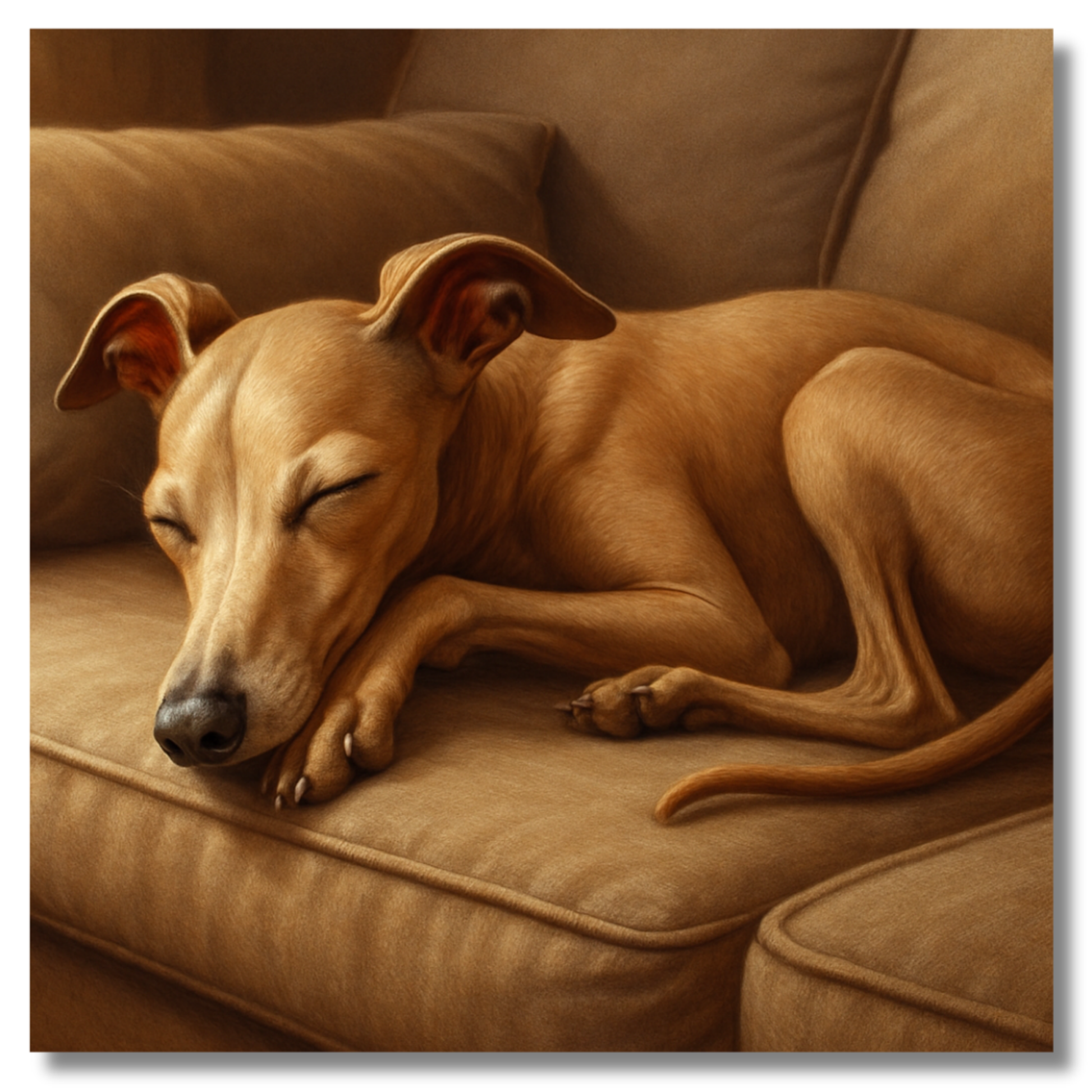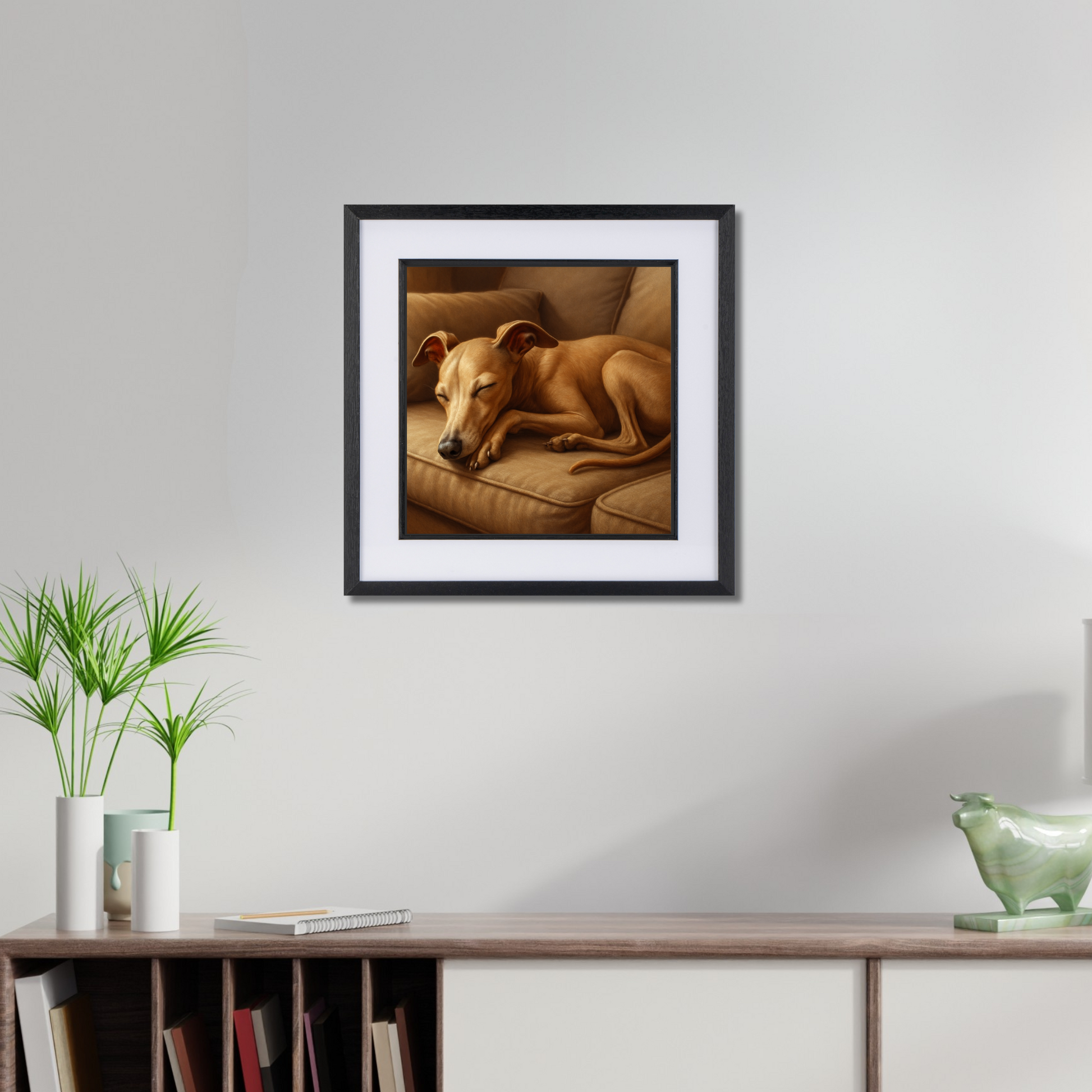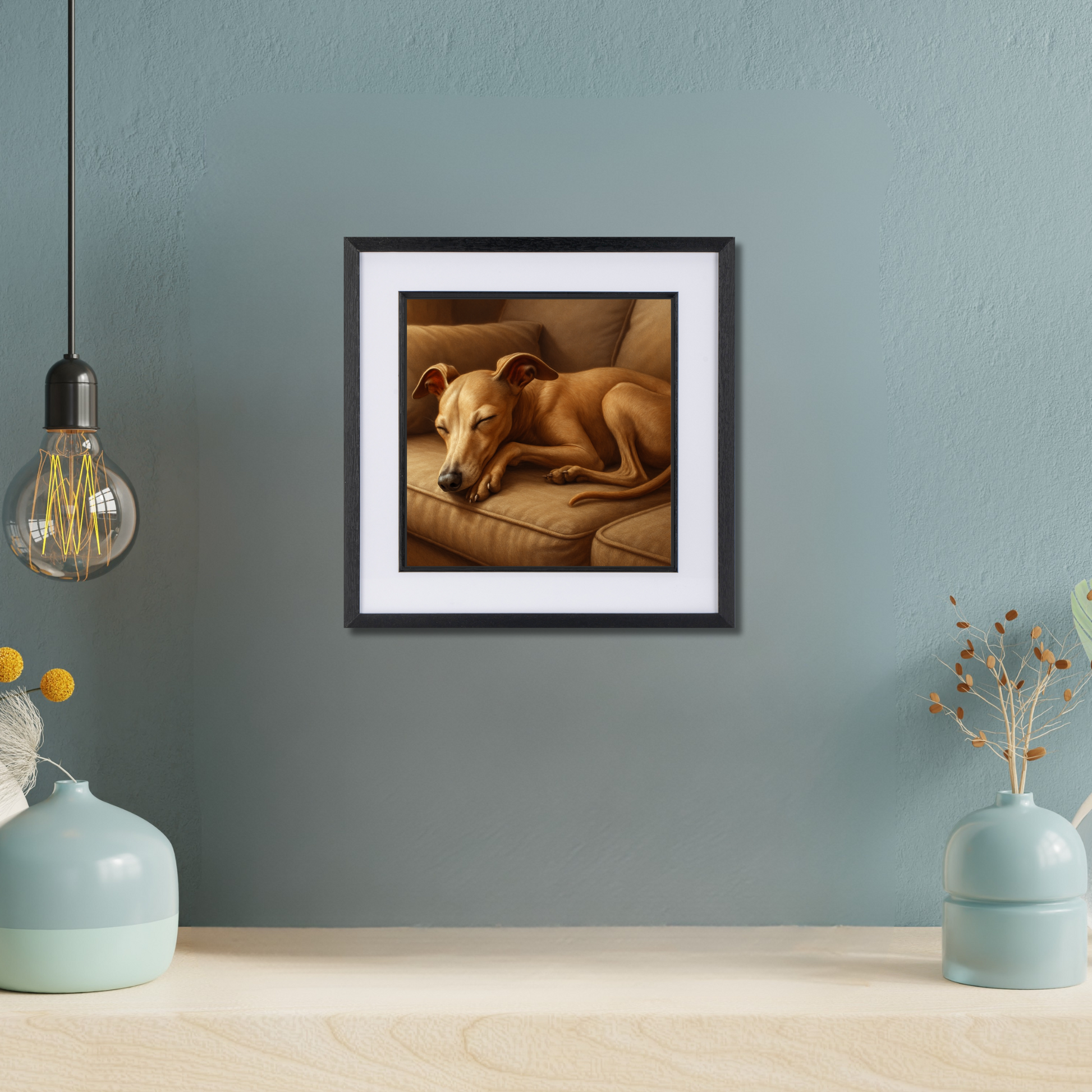 Graceful, lean, and deeply committed to rest, this elegant Whippet artwork captures the peaceful perfection of a well-earned snooze. Curled into the soft contours of a cosy sofa, this print brings calm and comfort to any space. Ideal for bedrooms, reading nooks, or anywhere in need of serenity, it’s a must-have for Whippet lovers and fans of minimalist, relaxed dog wall art.